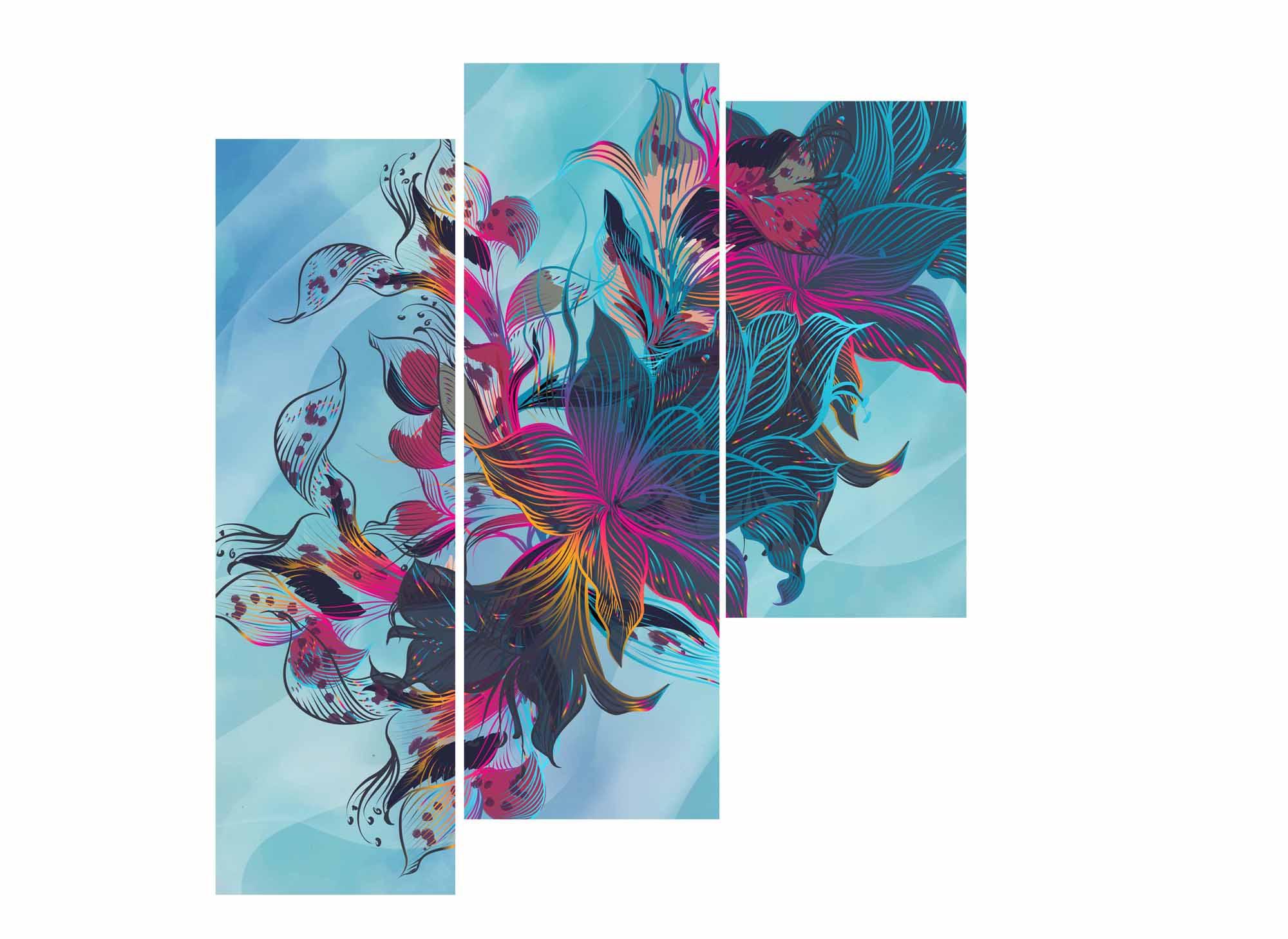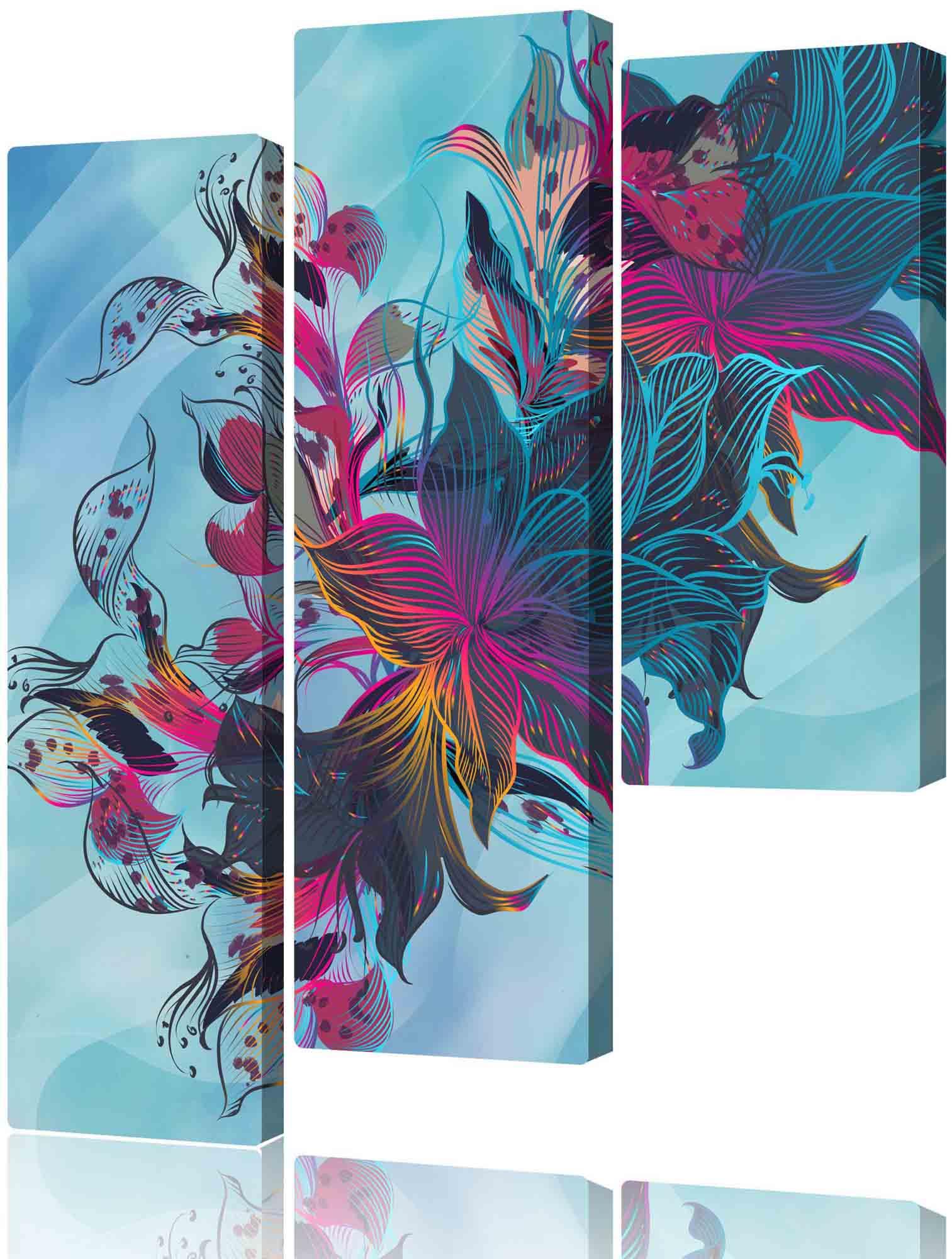 Modułowy obraz - wielobarwne kwiaty na niebieskim tle idealnie wpasują się w każde nowoczesne wnętrze salonu, biura czy kawiarni i będą cieszyć oko