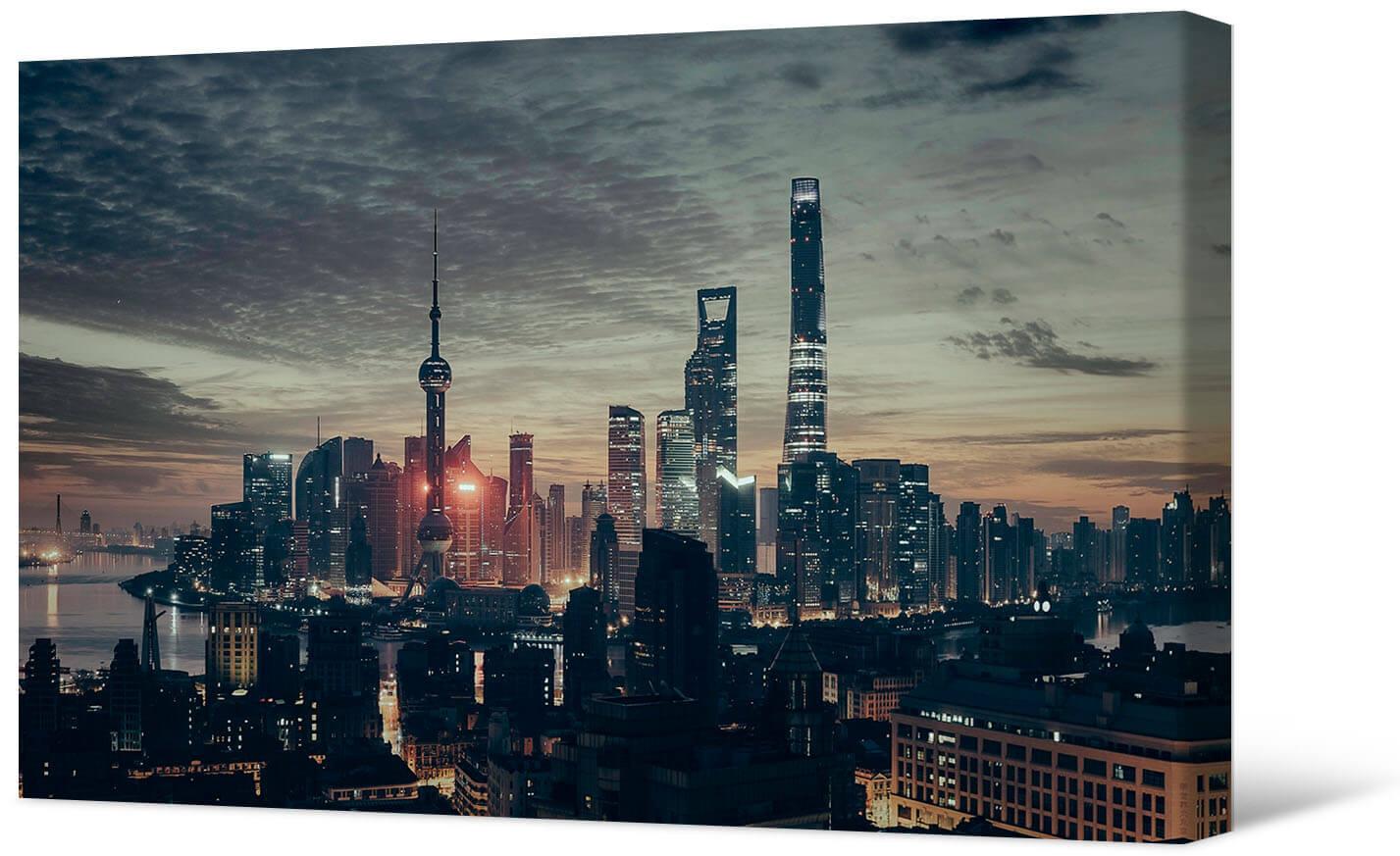 Fotografia na płótnie Nocne wieżowce. Budowle o zawrotnej wysokości to wspaniałe dzieła ludzkich rąk. Widok ich z wysokości, nocą, kiedy są oświetlone milionami świateł, jest szczególnie niesamowity.