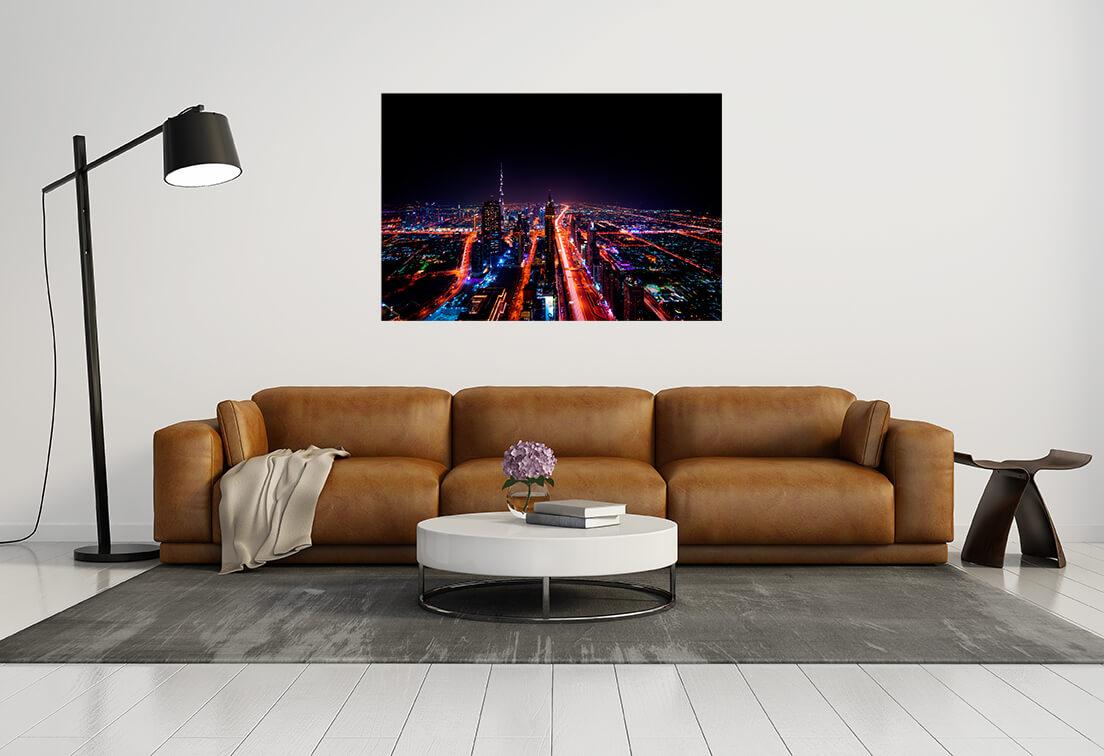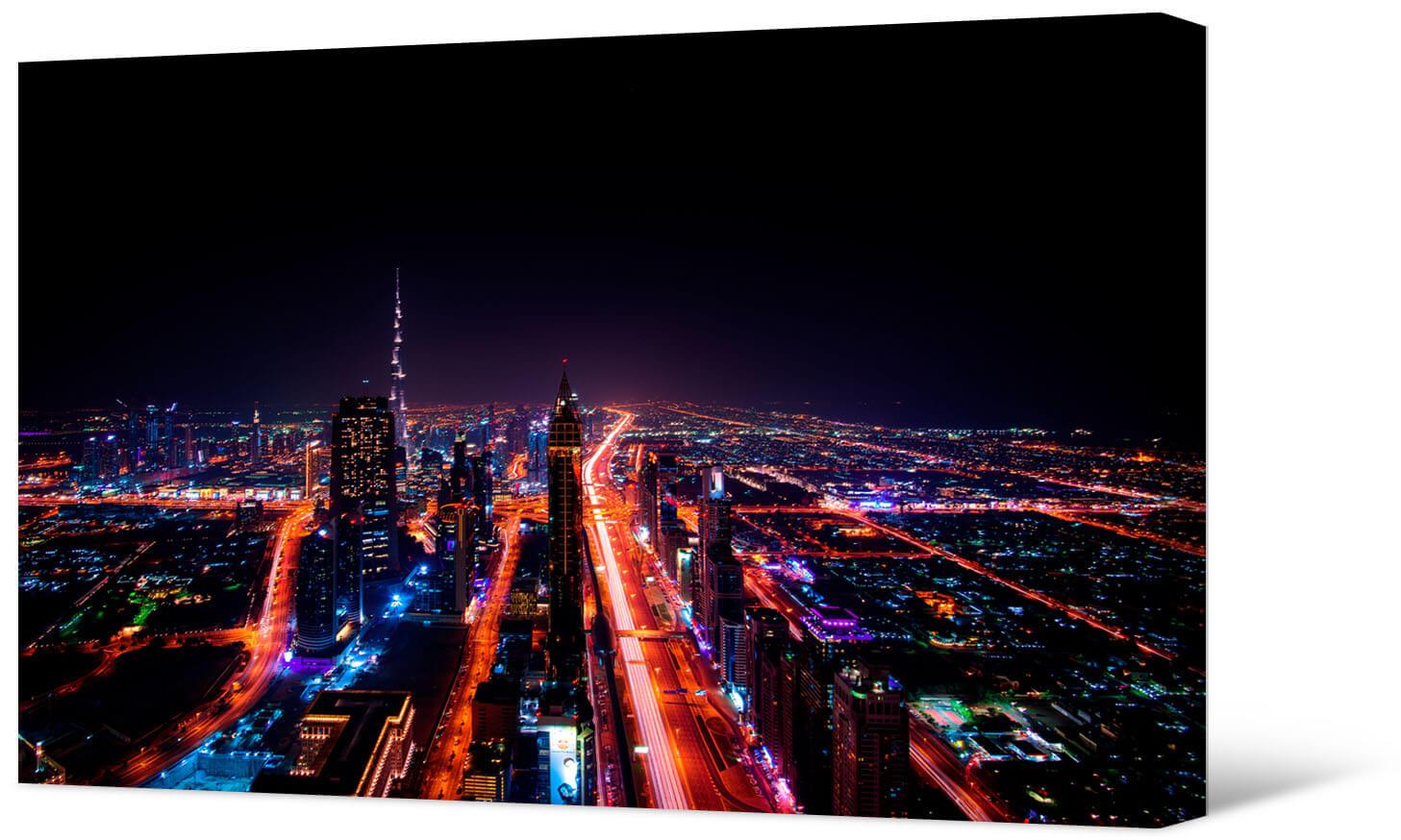 Fotografia na płótnie Widok na Dubaj nocą. Największe i najbogatsze miasto Zjednoczonych Emiratów Arabskich jest piękne nie tylko za dnia. Nocą zachwyca również swoim przepychem i przepychem.