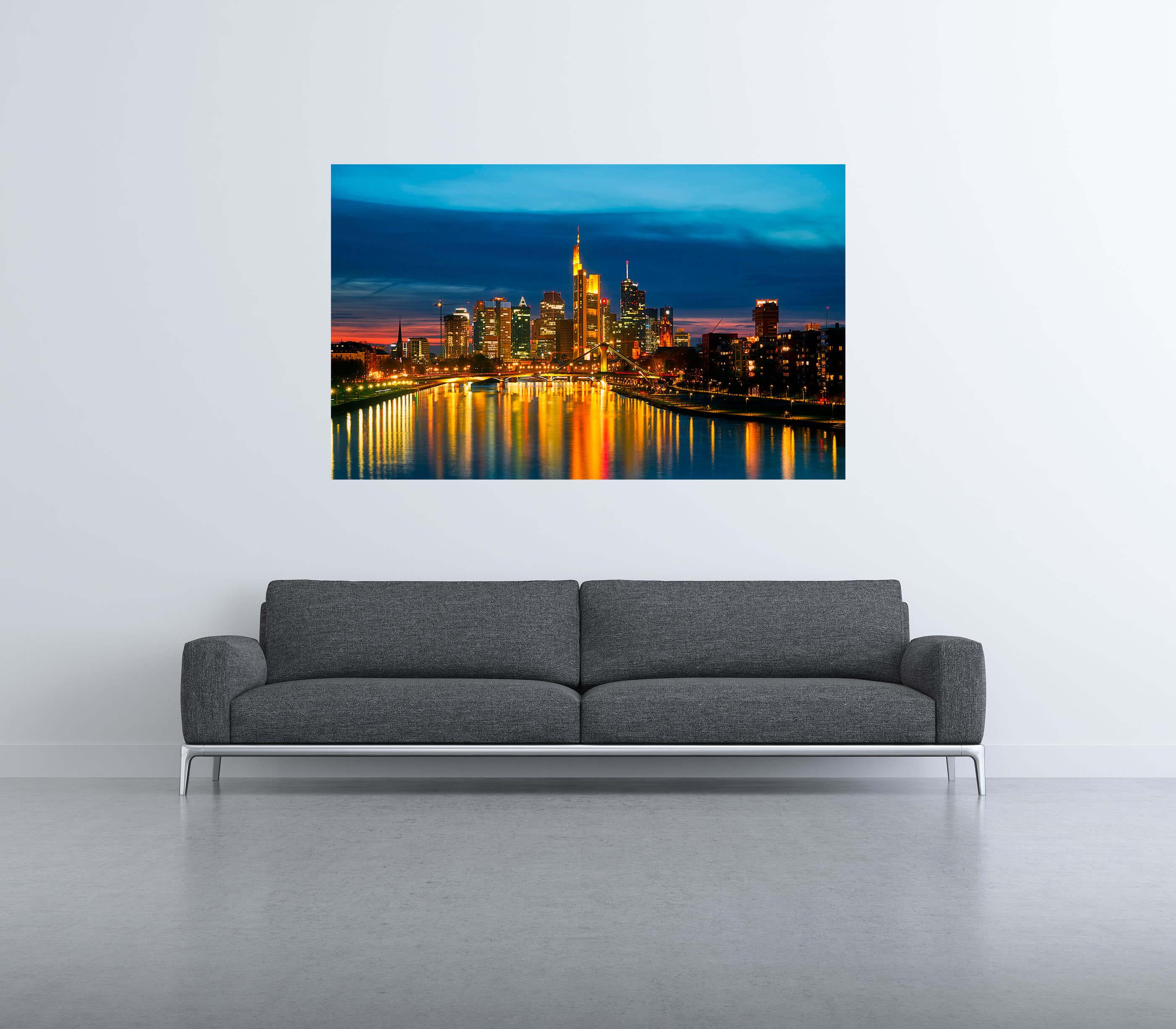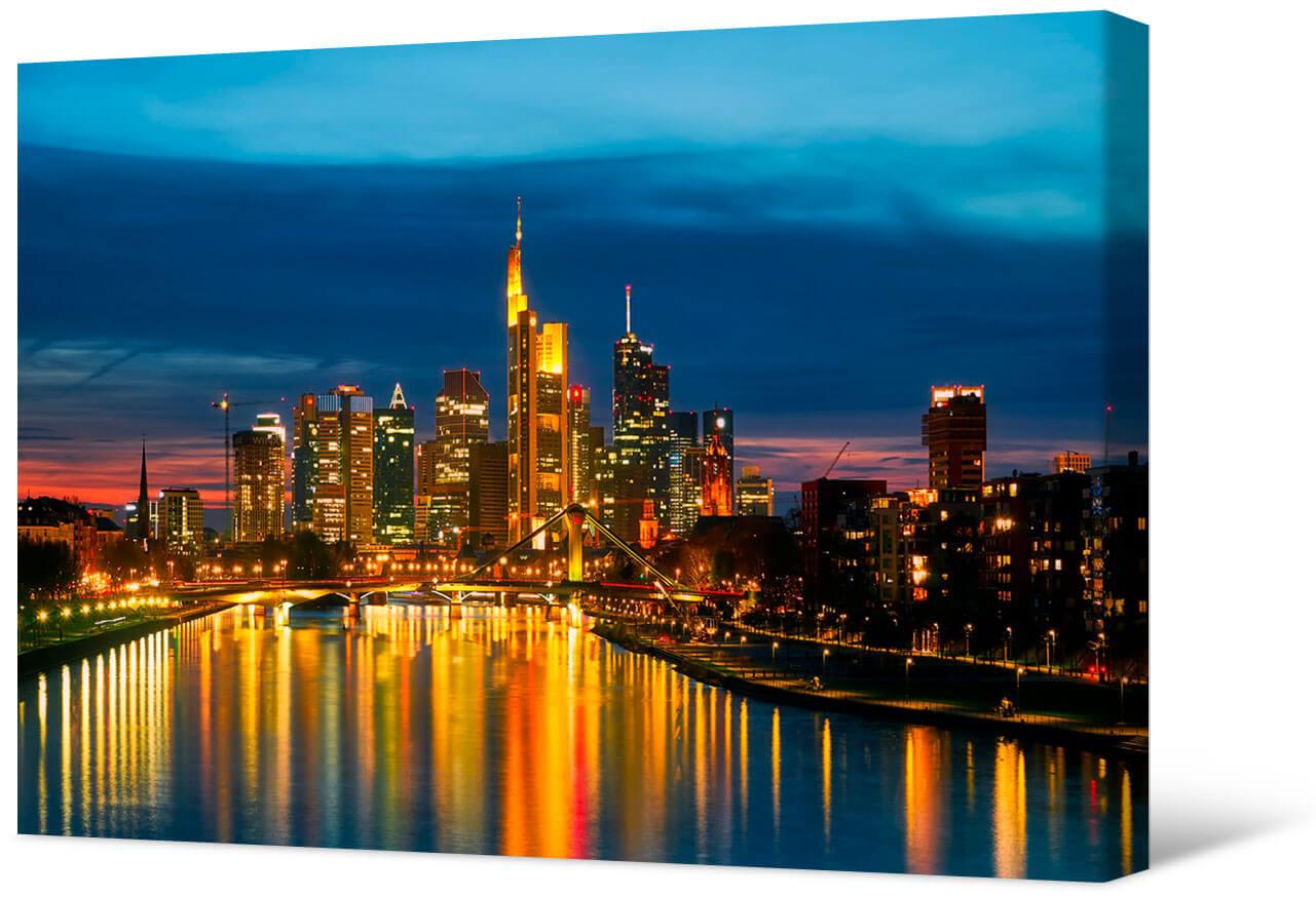 Malarstwo fotograficzne na płótnie Nocny Frankfurt nad Menem. Miasto położone jest w samym centrum Niemiec i jest ich stolicą kulturalną i biznesową. Wyraża się to w architekturze Frankfurtu nad Menem. Miasto żyje pełnią życia nie tylko za dnia, ale także nocą.