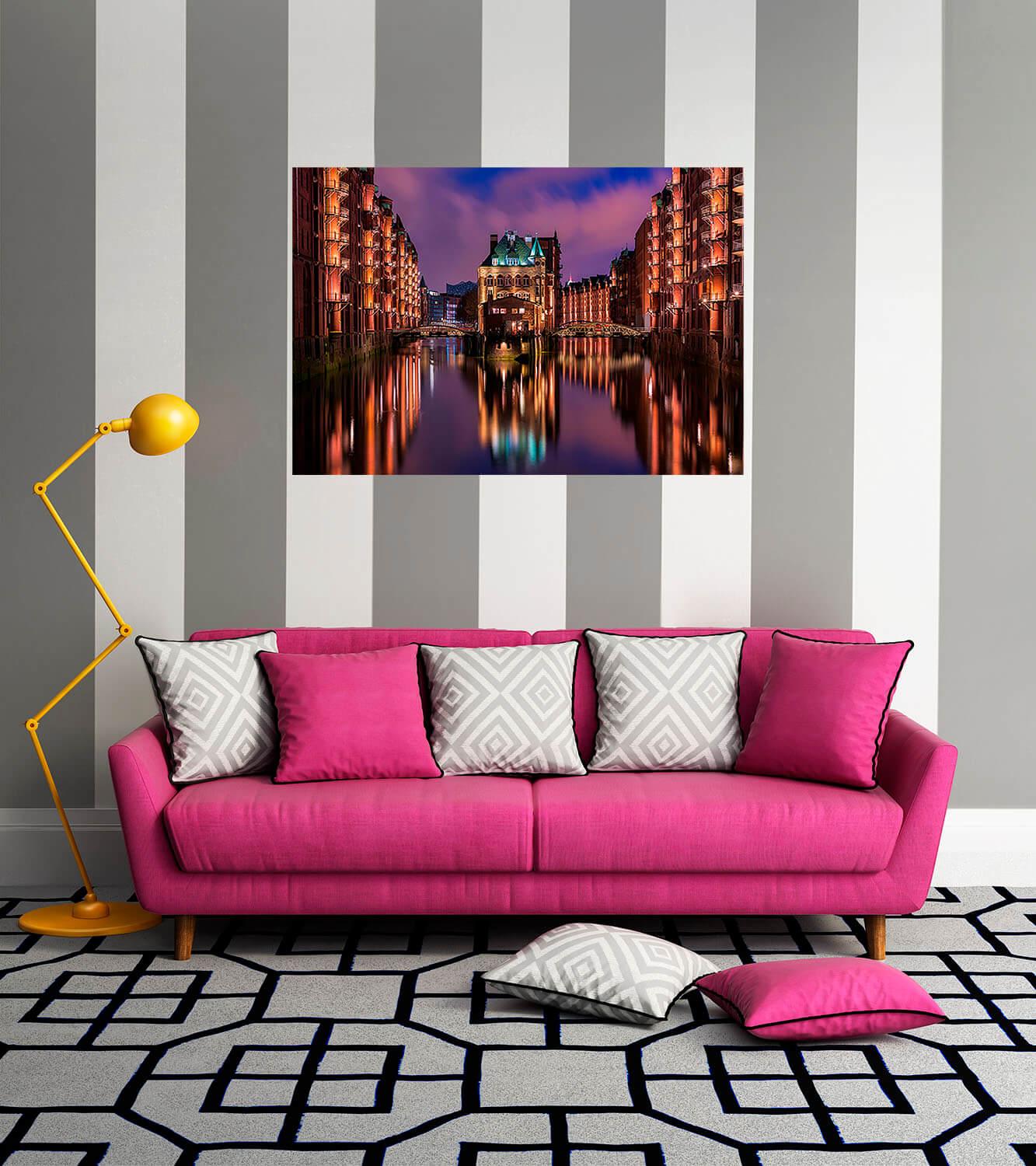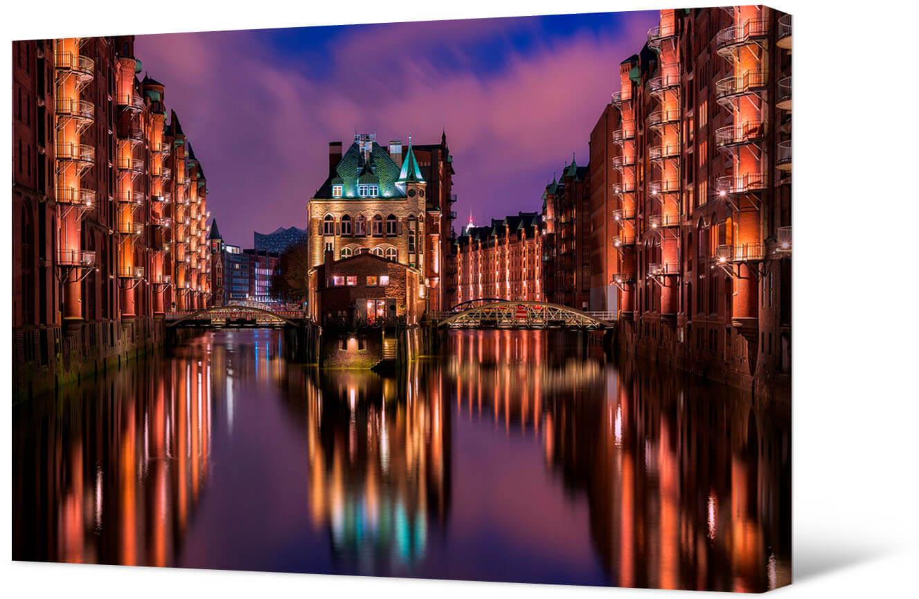 Malarstwo fotograficzne na płótnie Nocny Hamburg. To miasto jest największym miastem portowym w Niemczech. Znajduje się u zbiegu Łaby z Morzem Północnym. Hamburg jest bardzo piękny i słynie z niezliczonych kanałów i ogromnych parków.