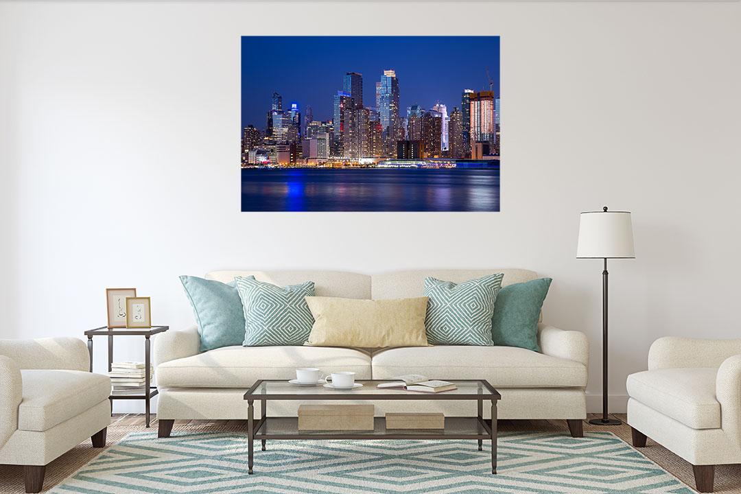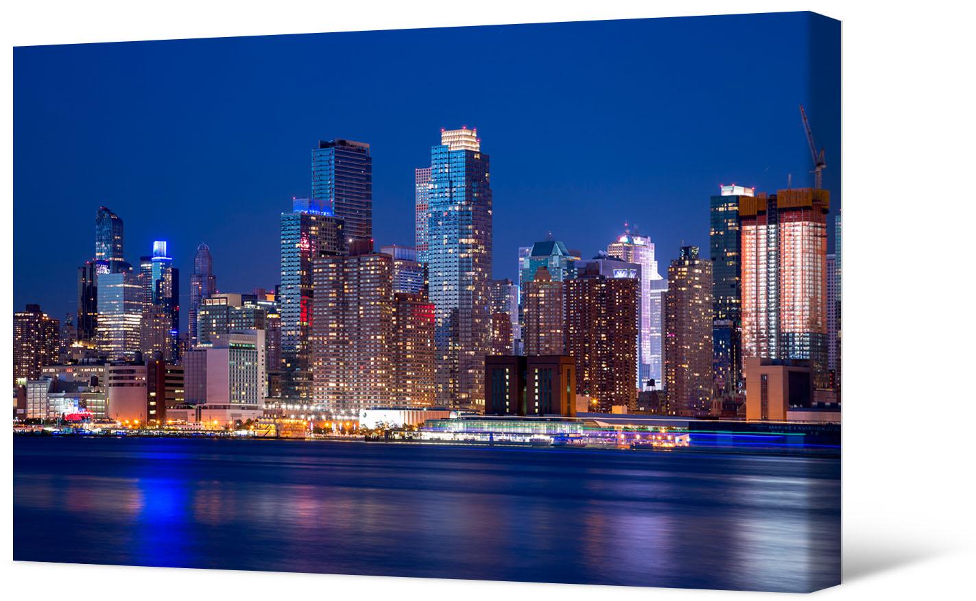 Fotografia na płótnie Widok na Nowy Jork nocą. Piękne zdjęcie, na którym uchwycono lśniące światła miasta nad oceanem.