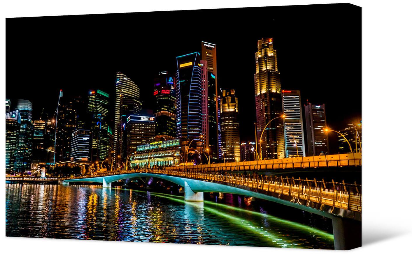 Malowanie fotografii na płótnie Nocny Singapur. Piękne nabrzeże z mostkami, mieniące się milionami światełek.