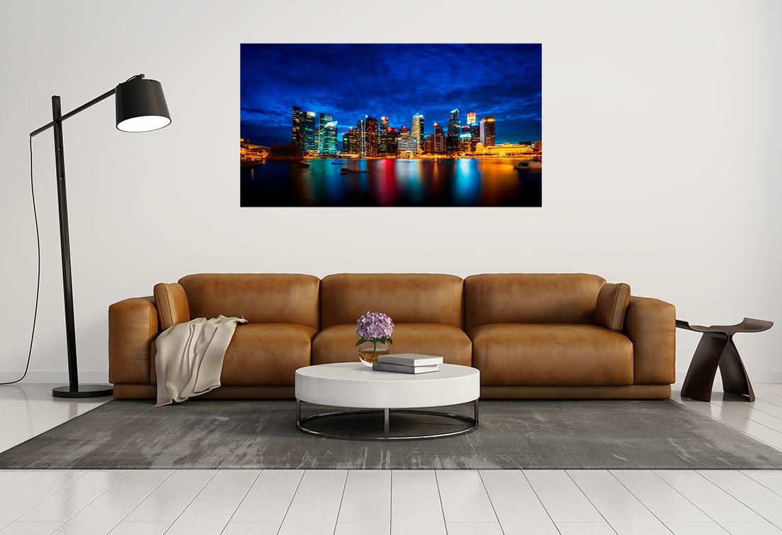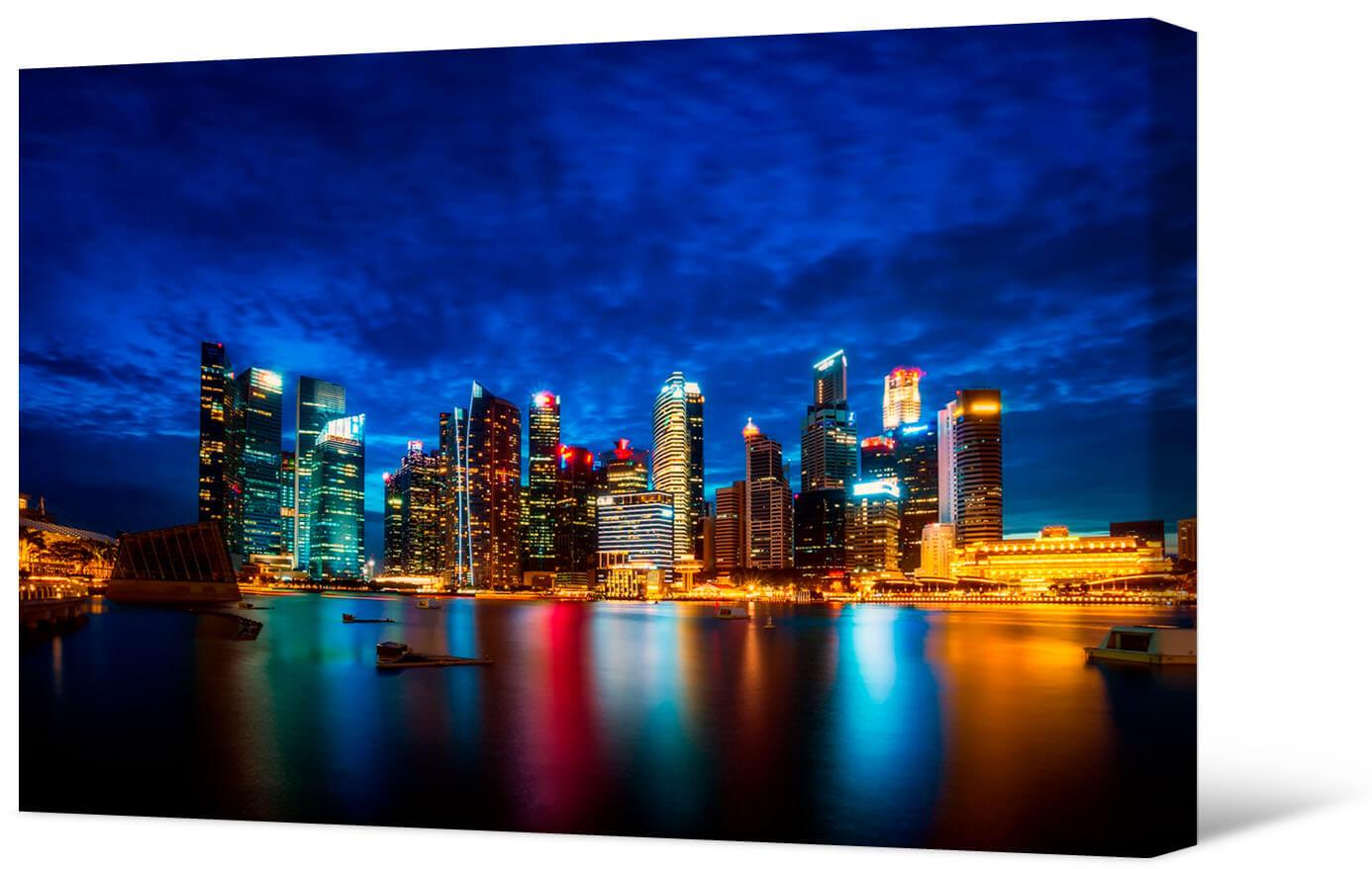 Fotografia na płótnie Widok z morza na Singapur. W tej perspektywie ta niesamowita metropolia jawi się w pełnej krasie. Zdjęcia nocne są szczególnie udane dzięki bogatemu oświetleniu.