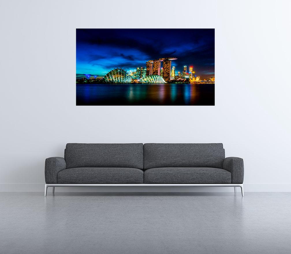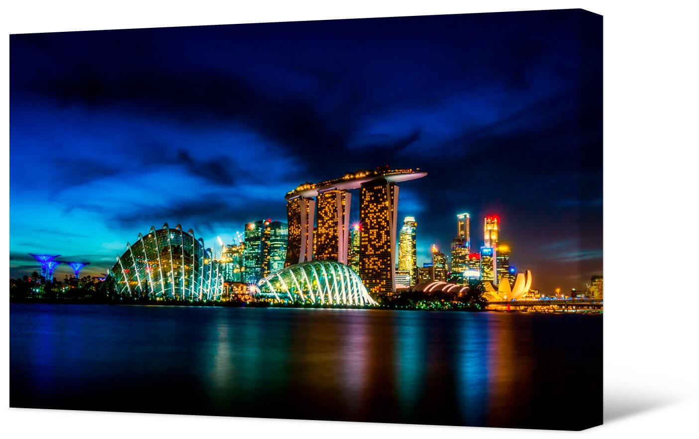 Zdjęcie na płótnie Gardens by the Bay w Singapurze. Jeden z najbardziej znanych i interesujących zabytków miasta. To ogromny park ze szklarniami, futurystycznymi drzewami, miejscami rozrywki i rekreacji. Ogrody nad zatoką nocą są pięknie oświetlone.