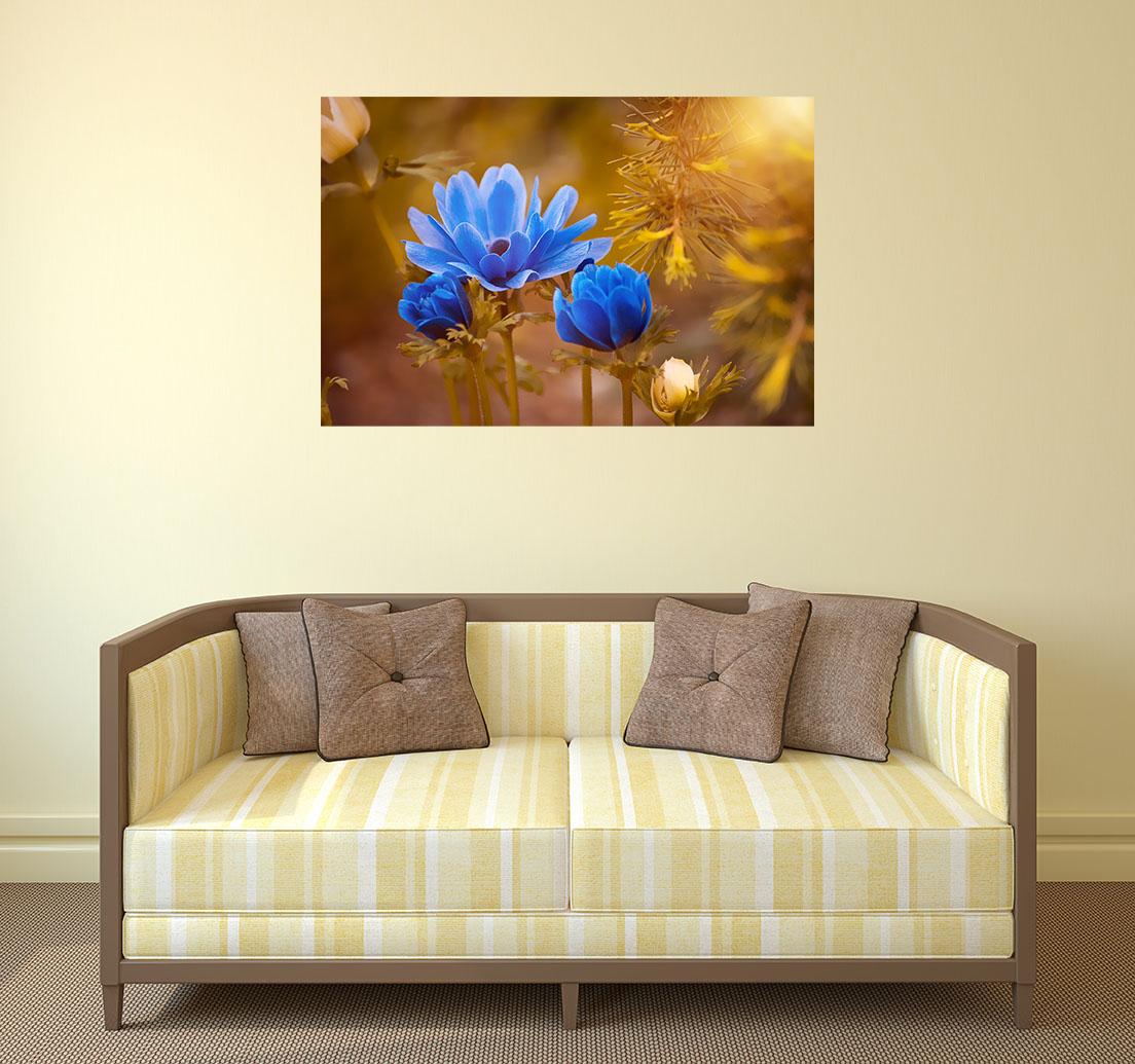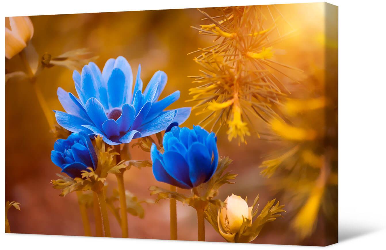 Fotografia na płótnie Niebieskie ukwiały. Przedstawione rośliny zachwycają swoją jasnością i delikatnością. Są romantyczne i eleganckie, ozdobią każde wnętrze.