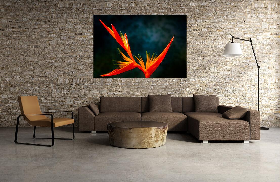 Fotografia na płótnie Strelicja - rajski kwiat. Bardzo efektowna roślina. Kształt kwiatu przypomina głowę dziwacznego dziwacznego ptaka. Rodzaj „czołu” i „dzioba” z niebieskich i pomarańczowych liści. Strelitzia jest symbolem niebiańskiego piękna.