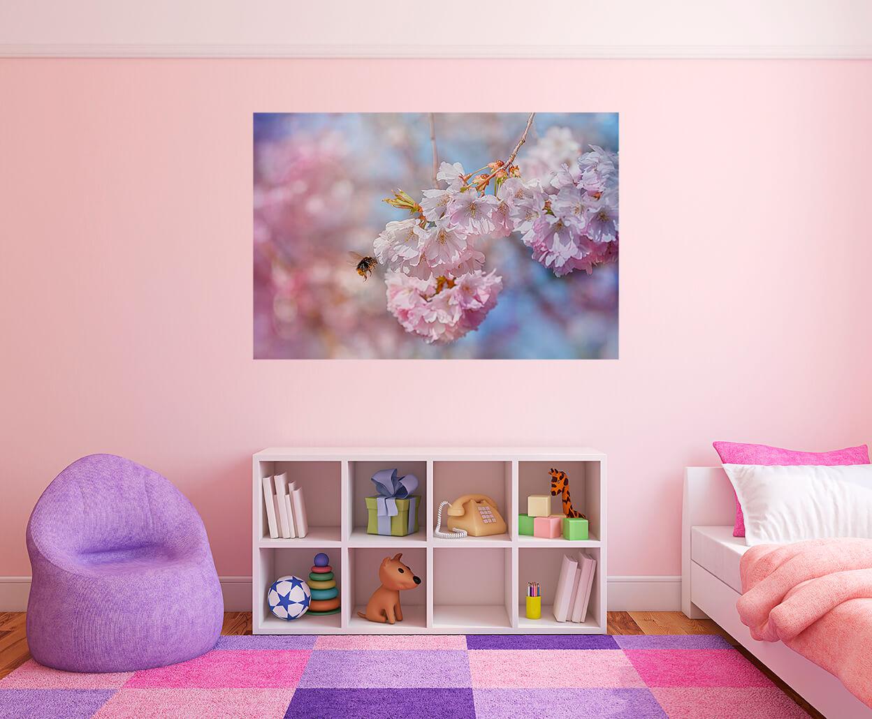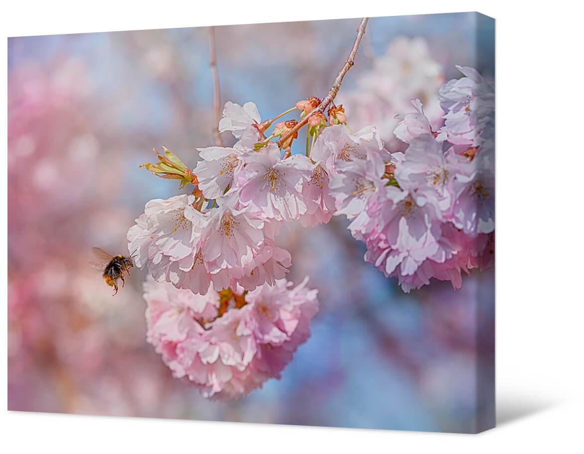 Fotografia na płótnie Kwitnąca gałąź. Uosabia triumf wiosny, przebudzenie życia. Na zdjęciu gałąź kwitnącego drzewa i pszczoła.