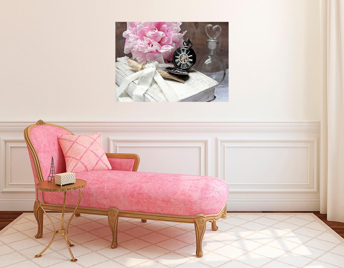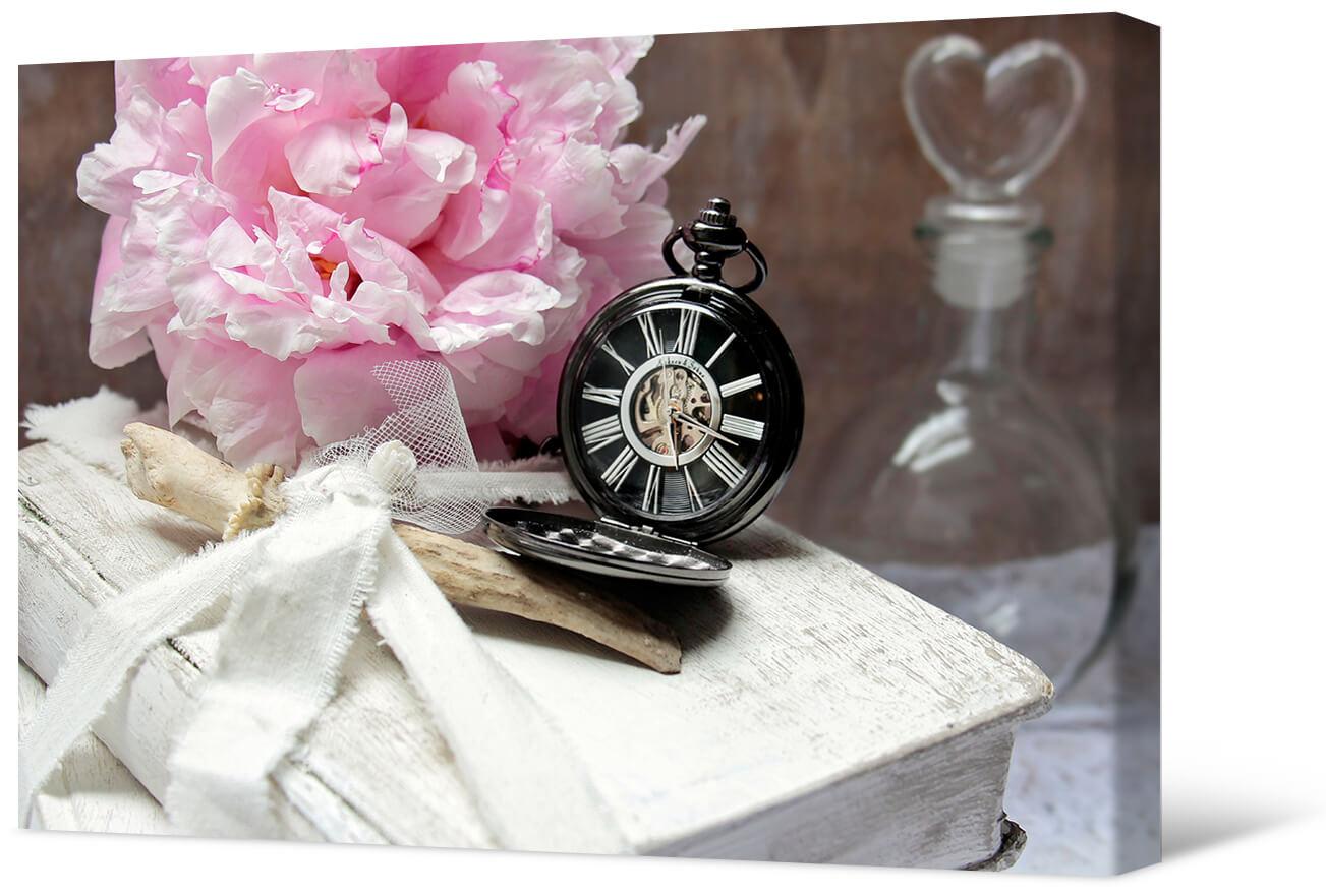 Fotografia na płótnie Martwa natura z zegarem. Romantyczny obraz z książką, zegarem ze staprinu i delikatną różową piwonią.