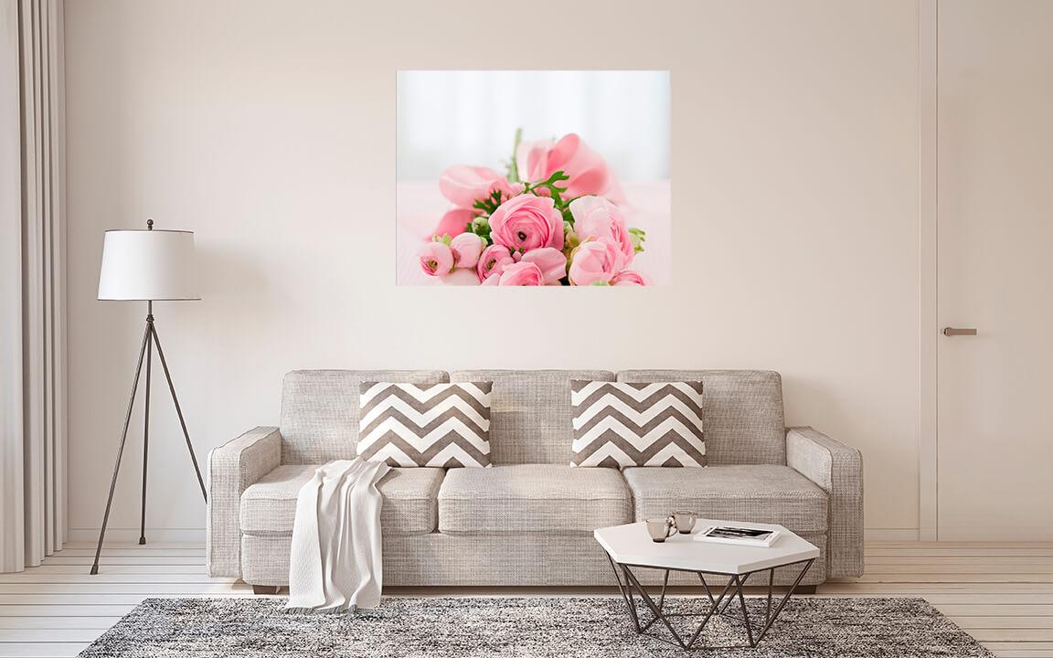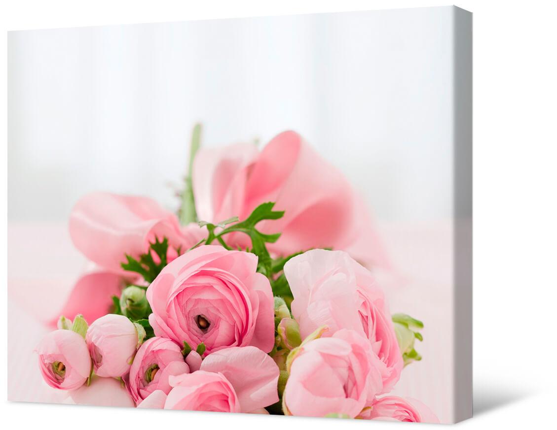 Fotografia na płótnie Bukiet różowych ranunculus. Te kwiaty przypominają róże, są tak samo gęste i piękne. Delikatny i uroczy obraz ozdobi Twoje wnętrze.