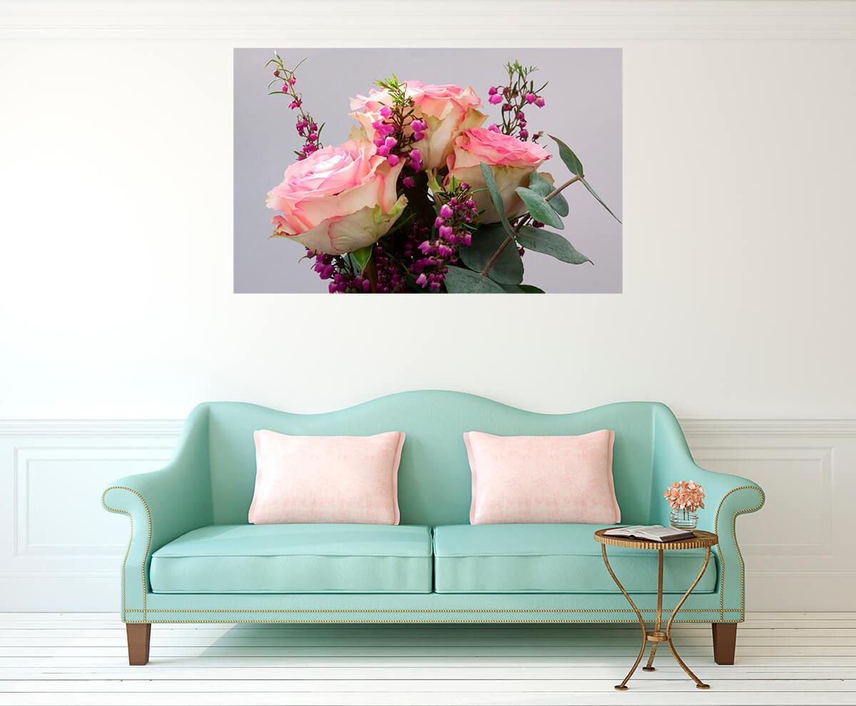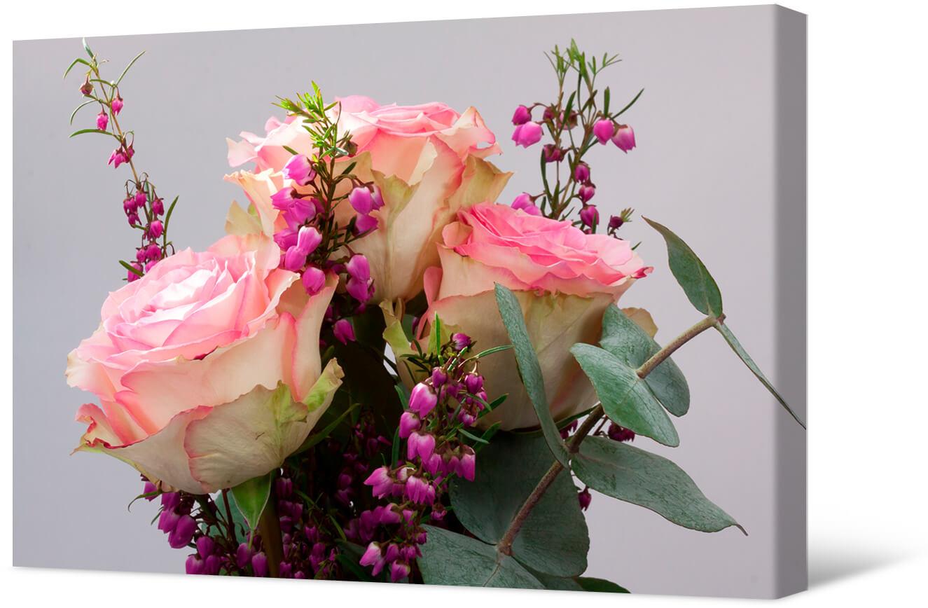 Fotografia na płótnie Bukiet z różowymi różami. Piękne i eleganckie pąki dobrze komponują się z zielenią. Uchwycony na zdjęciu bukiet będzie Cię poprawiał każdego dnia.