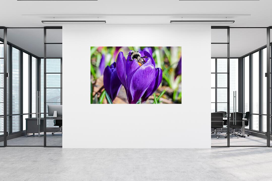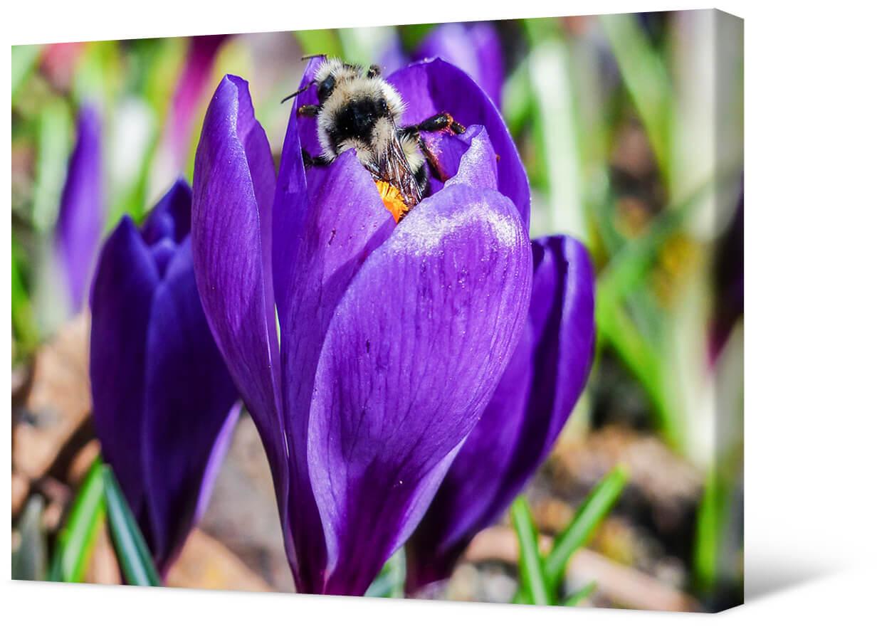 Zdjęcie krokusa i trzmiela. Pierwiosnki krokusów są bardzo delikatne i piękne. Jasne fioletowe kwiaty wyglądają jasno i wyraziście we wnętrzu.