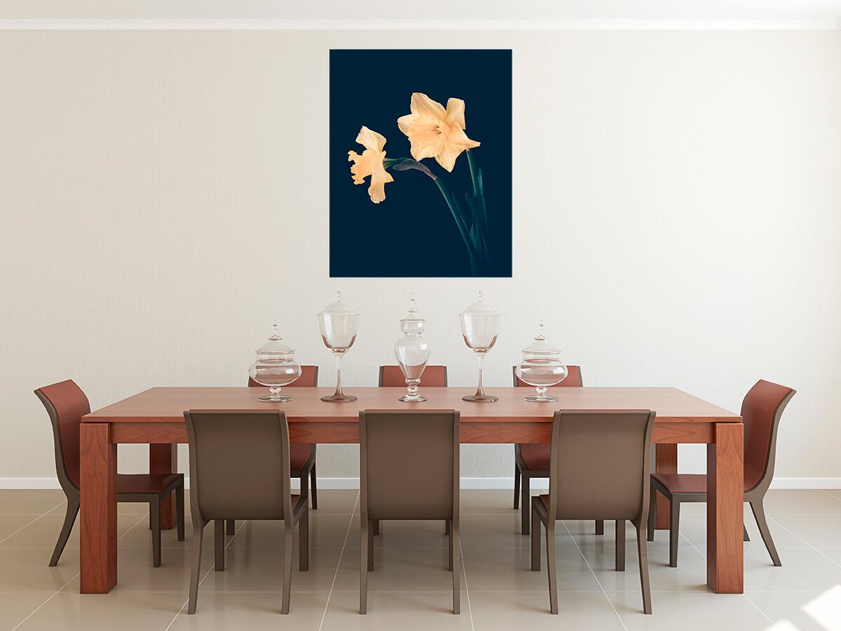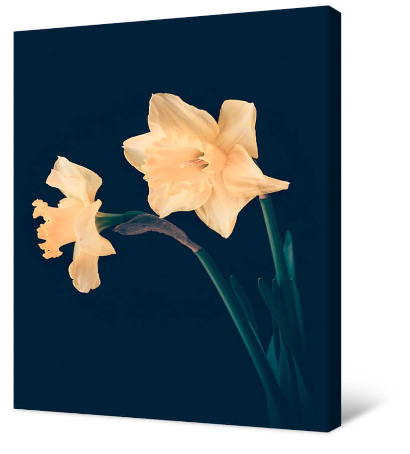 Fotokartka na płótnie Żonkile. Piękne i pełne wdzięku kwiaty wyglądają bardzo wyraziście na czarnym tle. Taki obraz uzupełni Twoje wnętrze i będzie ciekawym akcentem.