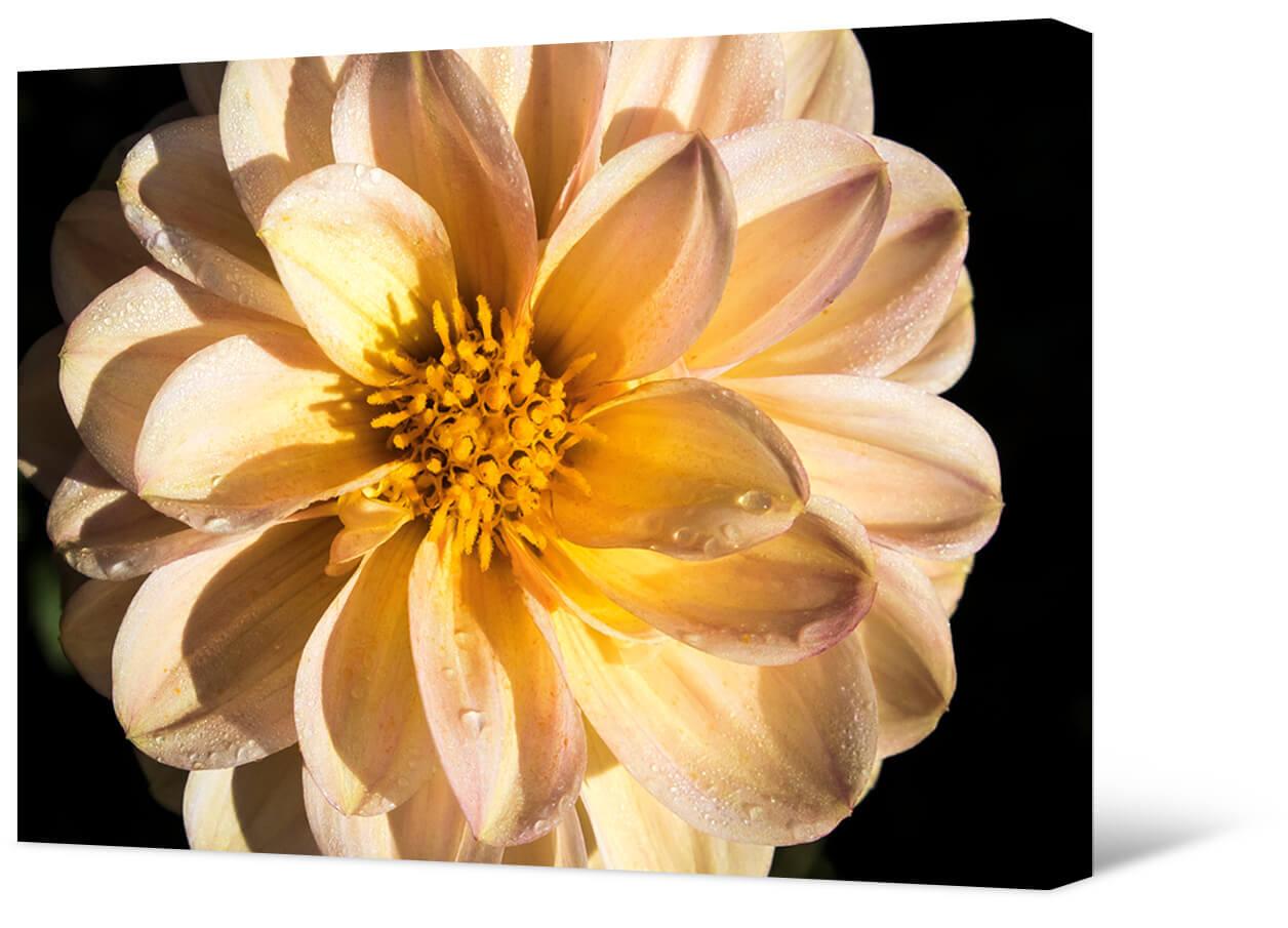 Fotografia na płótnie Różowa dalia. Kwiat oświetlony przez słońce uchwycono z bliska, ze szczegółami w każdym płatku. Dalia jest uważana za symbol wszechzwycięskiej mocy życia, wytrzymałości, wolności, niezwyciężoności i dumy.