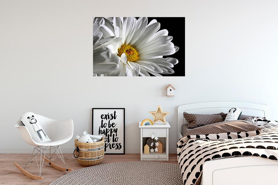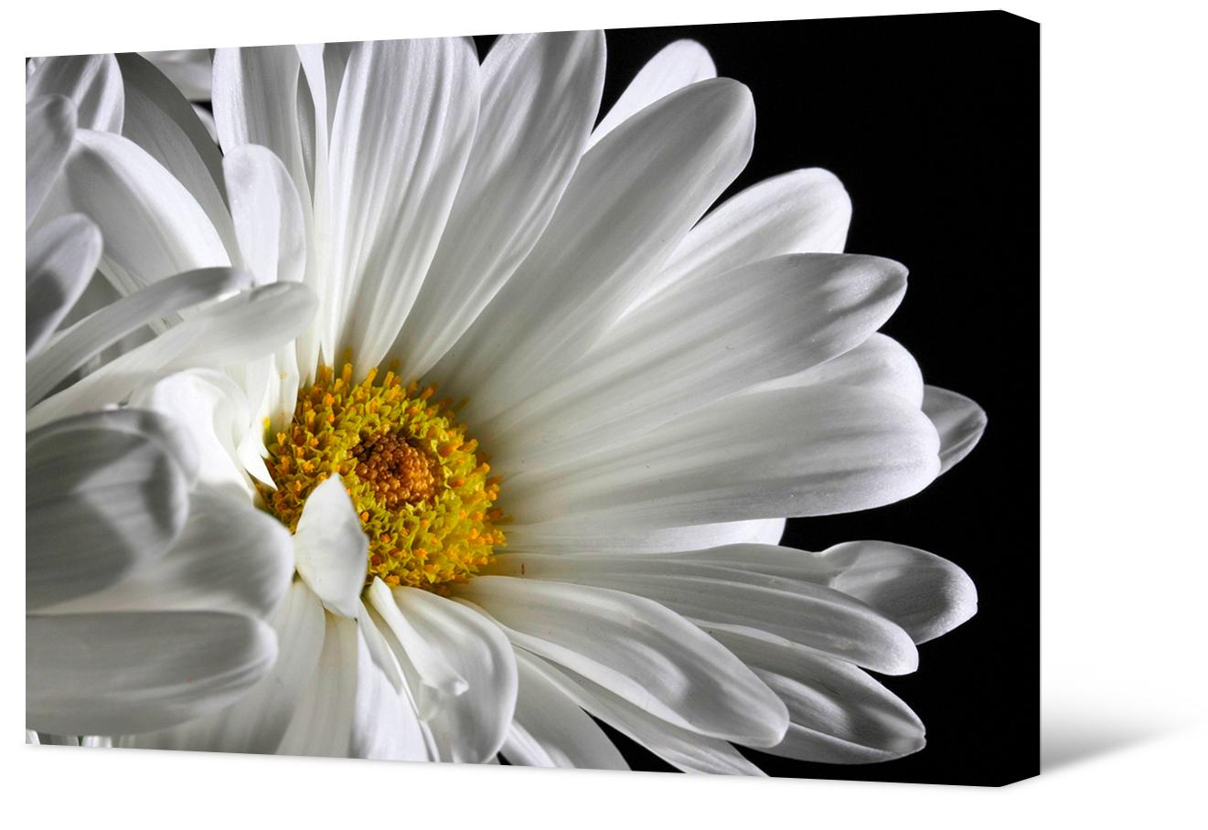 Malowanie fotografii na płótnie Makrofotografia rumianku. Wysokiej jakości obraz pozwala zbadać kwiat w najdrobniejszych szczegółach. Szczególnie efektownie prezentuje się rumianek na czarnym tle.