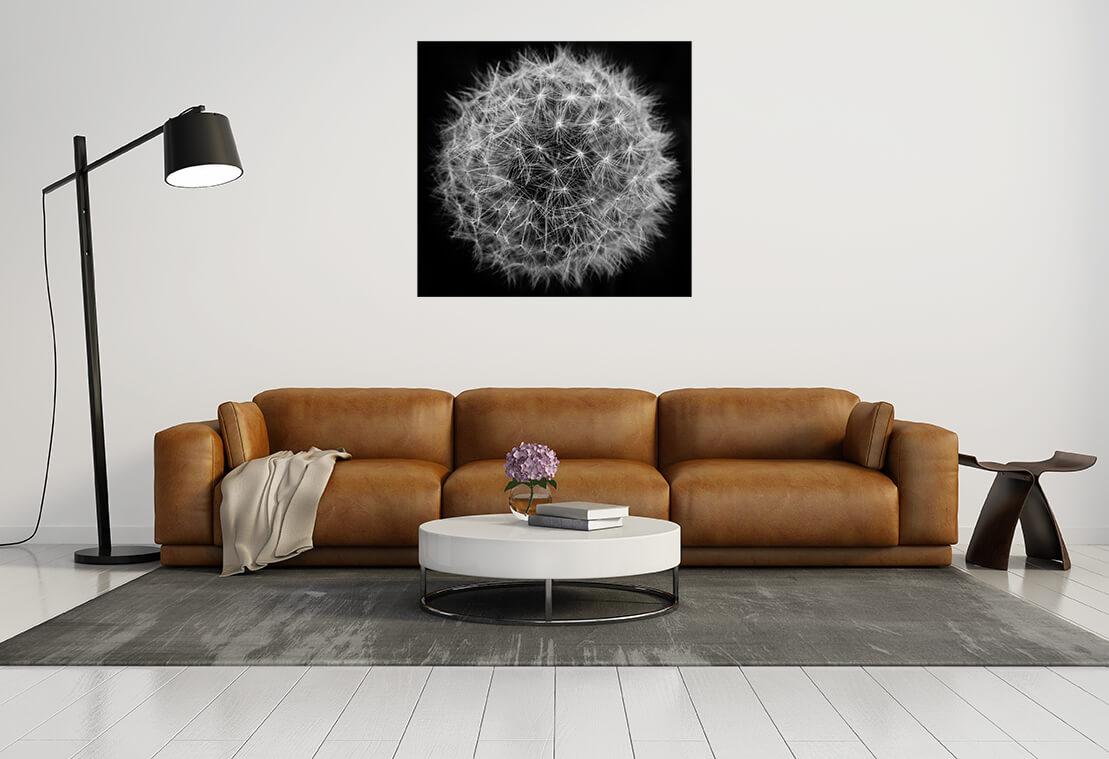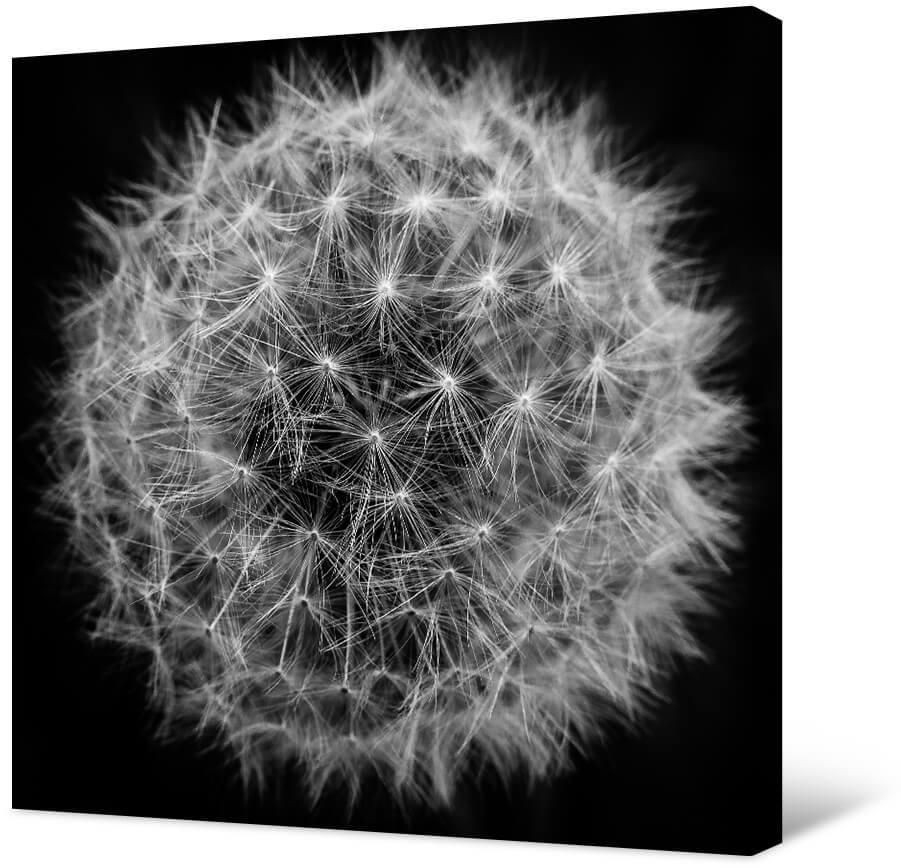 Malowanie zdjęć na płótnie Mniszek lekarski. Kwiat jest przedstawiony na czarnym tle, w dużym formacie. Puszyste dmuchawce w tej perspektywie wyglądają delikatnie i bardzo efektownie.