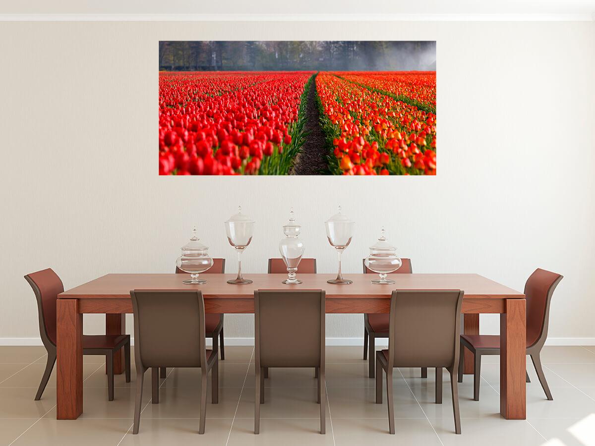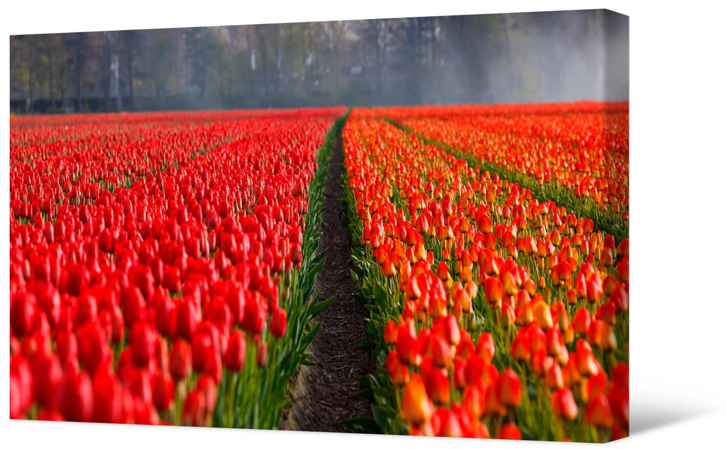 Fotografia na płótnie Pole tulipanów. Pola kwiatowe wyglądają bardzo efektownie na żywo i na zdjęciu. Można je kochać bez końca. Jasne zdjęcie ozdobi Twój dom.