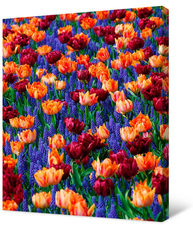 Malarstwo fotograficzne na płótnie Muscari i tulipany. Te wiosenne kwiaty doskonale się ze sobą łączą. Jasnoniebieskie odcienie mysiego hiacyntu harmonijnie kontrastują z czerwonymi i pomarańczowymi tulipanami.