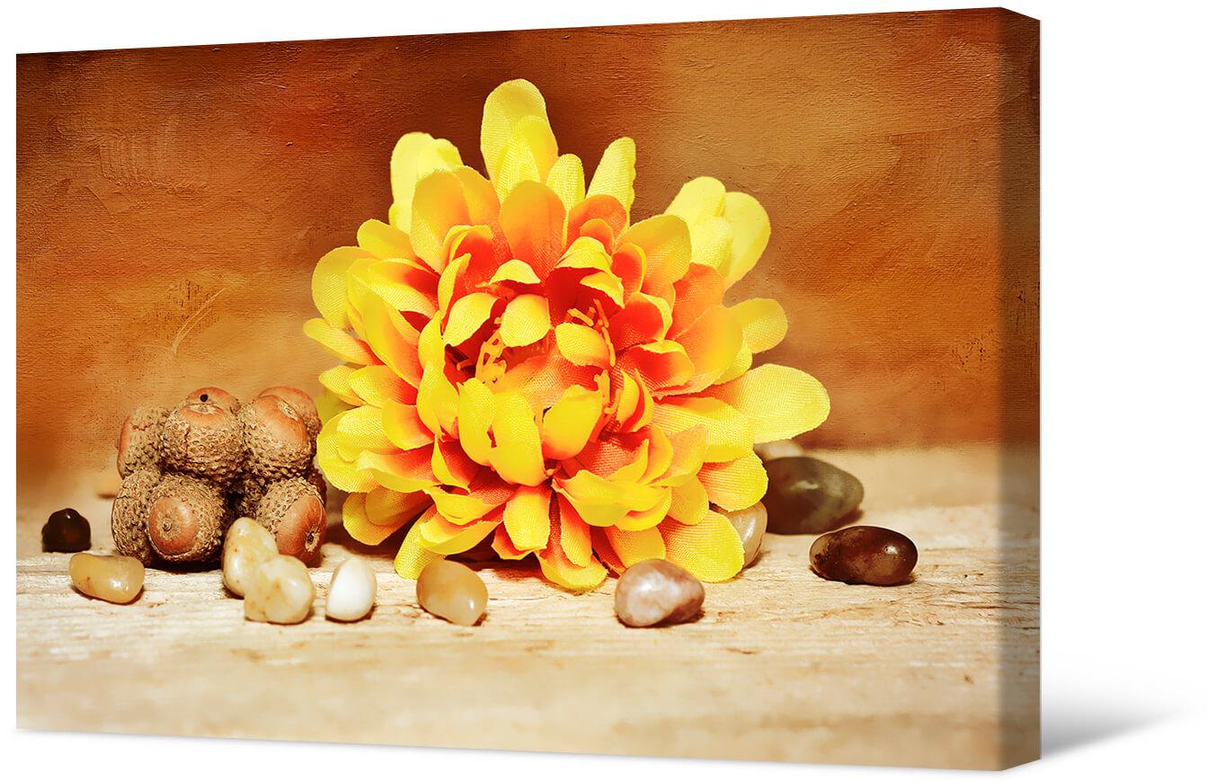 Malowanie fotografii na płótnie Martwa natura z żółtym kwiatem i żołędziami. Nieskomplikowana fabuła i piękne połączenie kolorów to tajemnica popularności tej pracy.