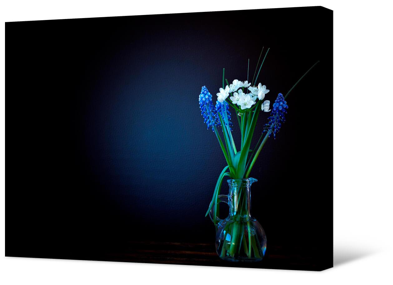 Fotografia na płótnie Bukiet muscari. Te wiosenne kwiaty są jasne i atrakcyjne. Wizerunek takiego bukietu na granatowym tle stanie się oryginalnym akcentem we wnętrzu jego właścicielki.