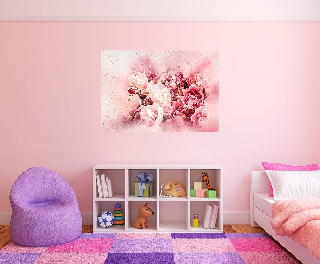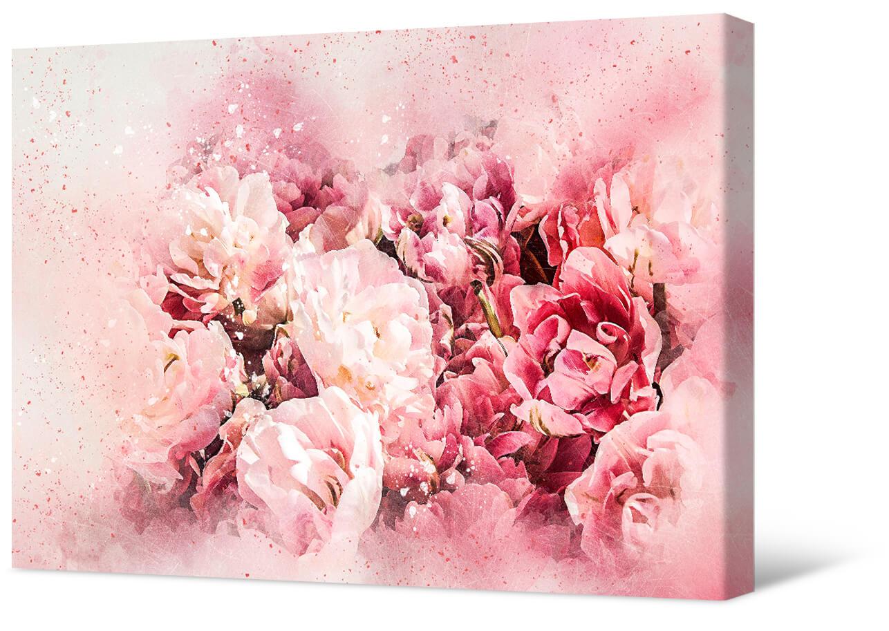 Malowanie zdjęć na płótnie Akwarela różowy bukiet. Wykonane w stylu całkowicie imitującym akwarelową technikę malarską. Delikatne i półprzezroczyste odcienie różowych kwiatów zachwycają i przyciągają uwagę.