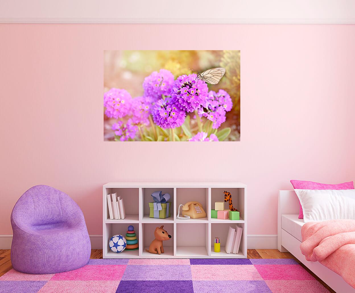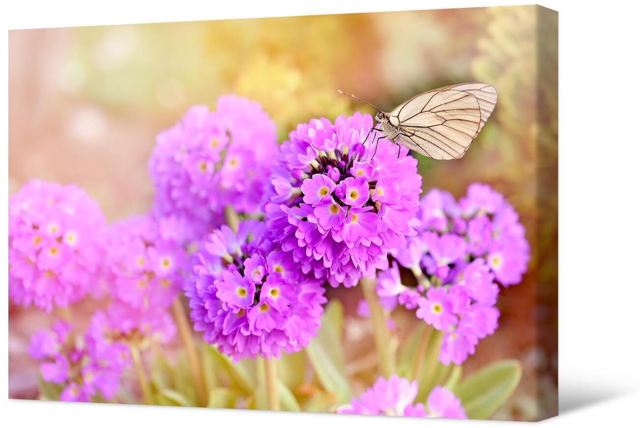 Fotografia na płótnie Kwiaty i motyl. Jasny, letni, wesoły obrazek. Pełen wdzięku motyl siedzący na fioletowych kwiatach. Fotoobraz znajdzie swoje miejsce w salonie, sypialni, pokoju dziecięcym.