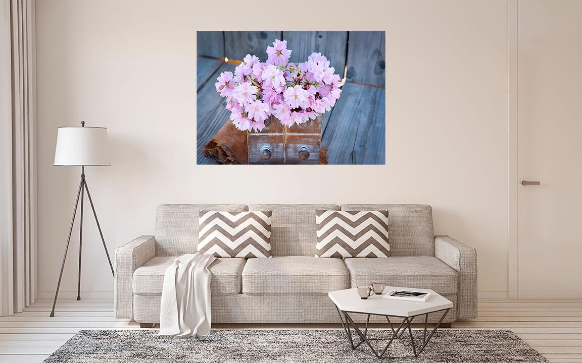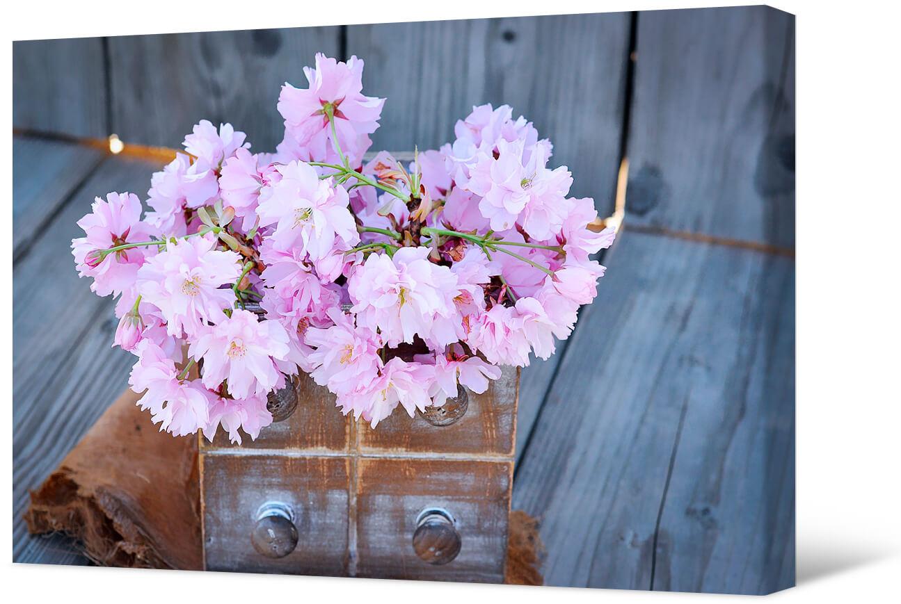 Fotografia na płótnie Martwa natura z pudełkiem. Obraz w stylu vintage, stare drewniane pudełko i delikatne różowe kwiaty. Taki obraz znajdzie swoje miejsce w salonie, sypialni, pokoju dziecięcym.