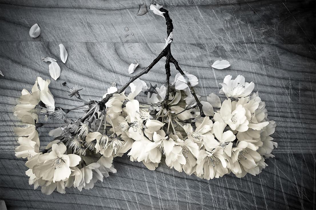 Fotografia na płótnie Kwitnąca wiązka czarno-biała. Bardzo oryginalny i efektowny obraz. Czarno-białe odcienie nadają mu szczególnej wyrazistości i wyrazistości.