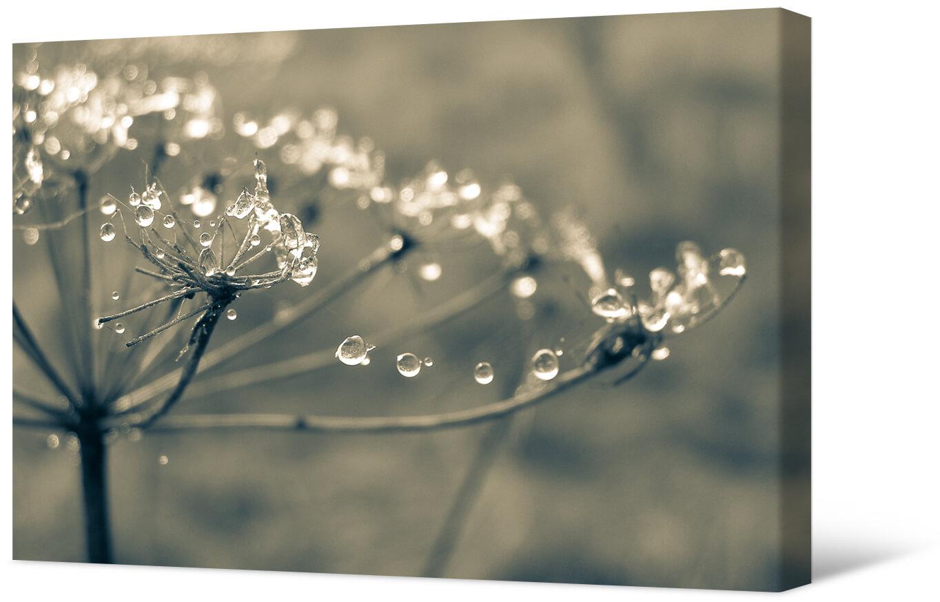 Fotografia na płótnie Pajęczyny i rosa. Makro przedstawiające roślinę parasolową splecioną z patyną i pokrytą drobnymi kroplami rosy. Obraz jest czarno-biały, oryginalny i stylowy.