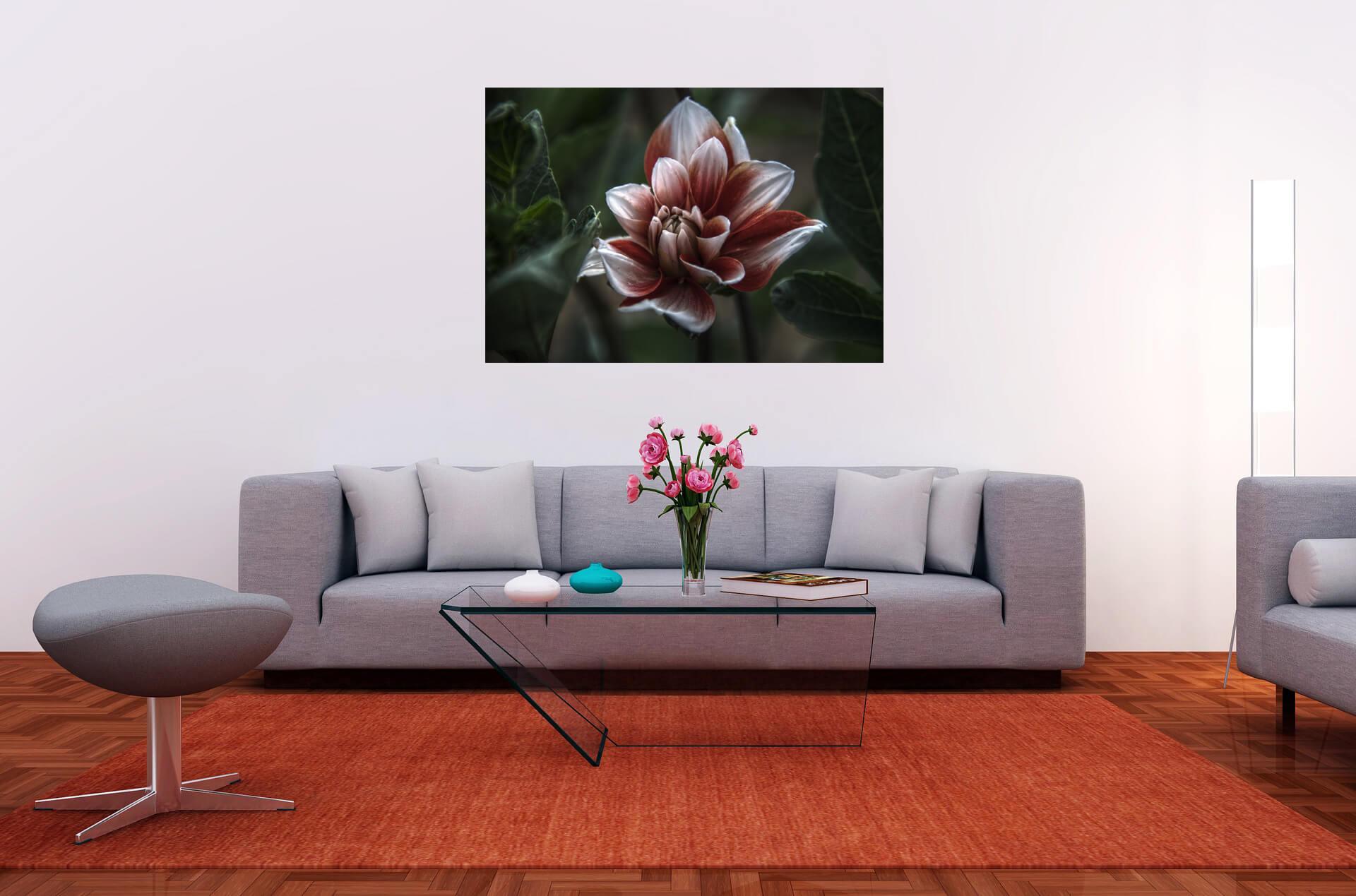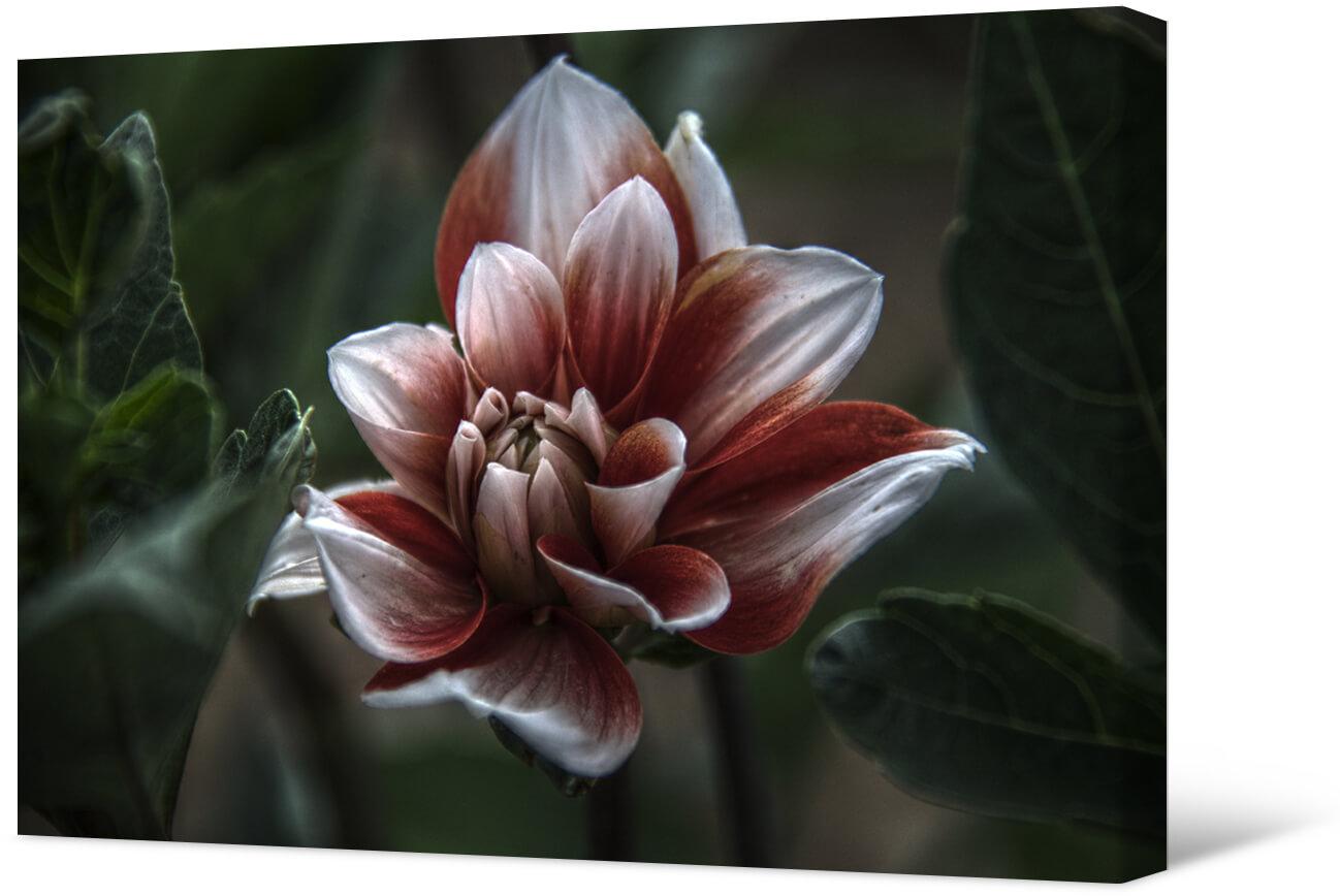 Fotografia malowana na płótnie czerwono-biała dalia. Przedstawiony jest na wpół otwarty pąk pięknego kwiatu. Obraz można umieścić we wnętrzu salonu, sypialni.
