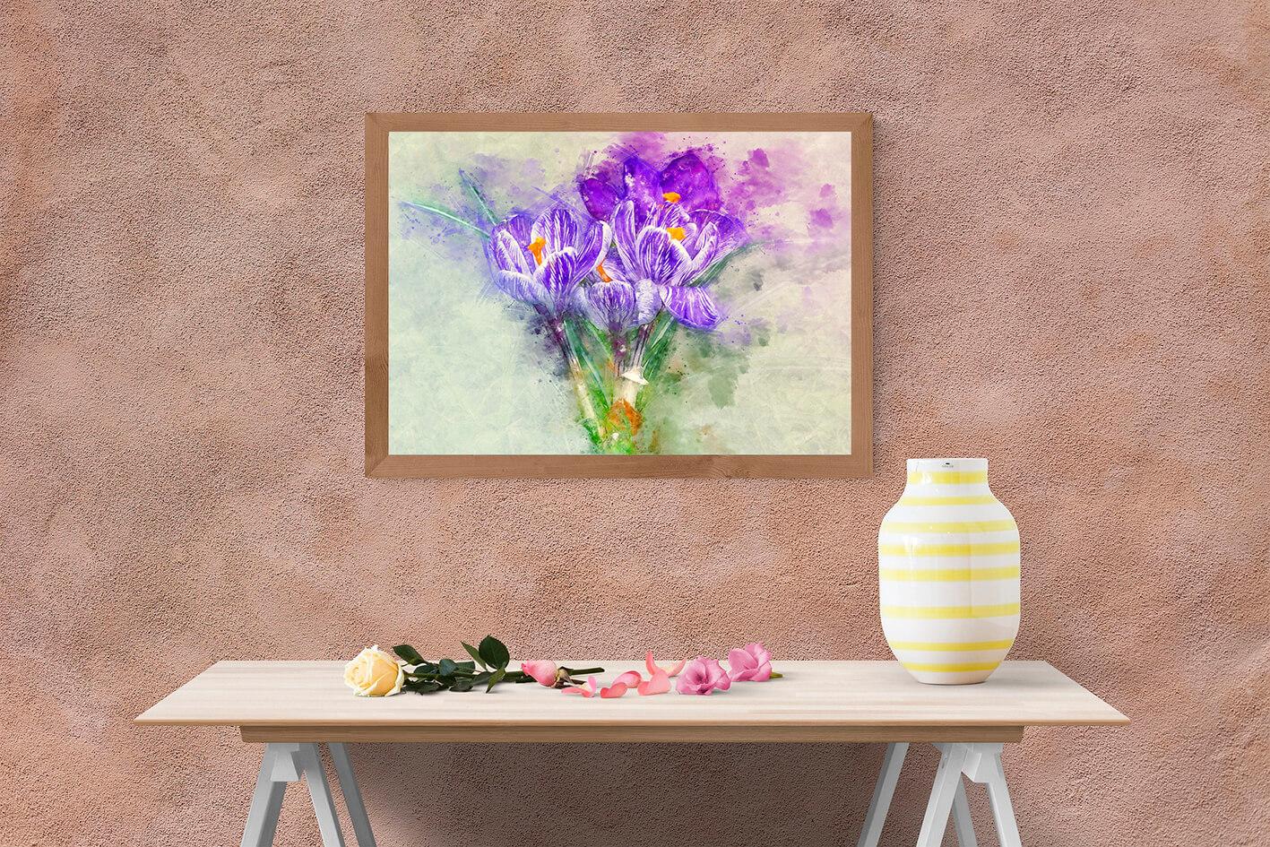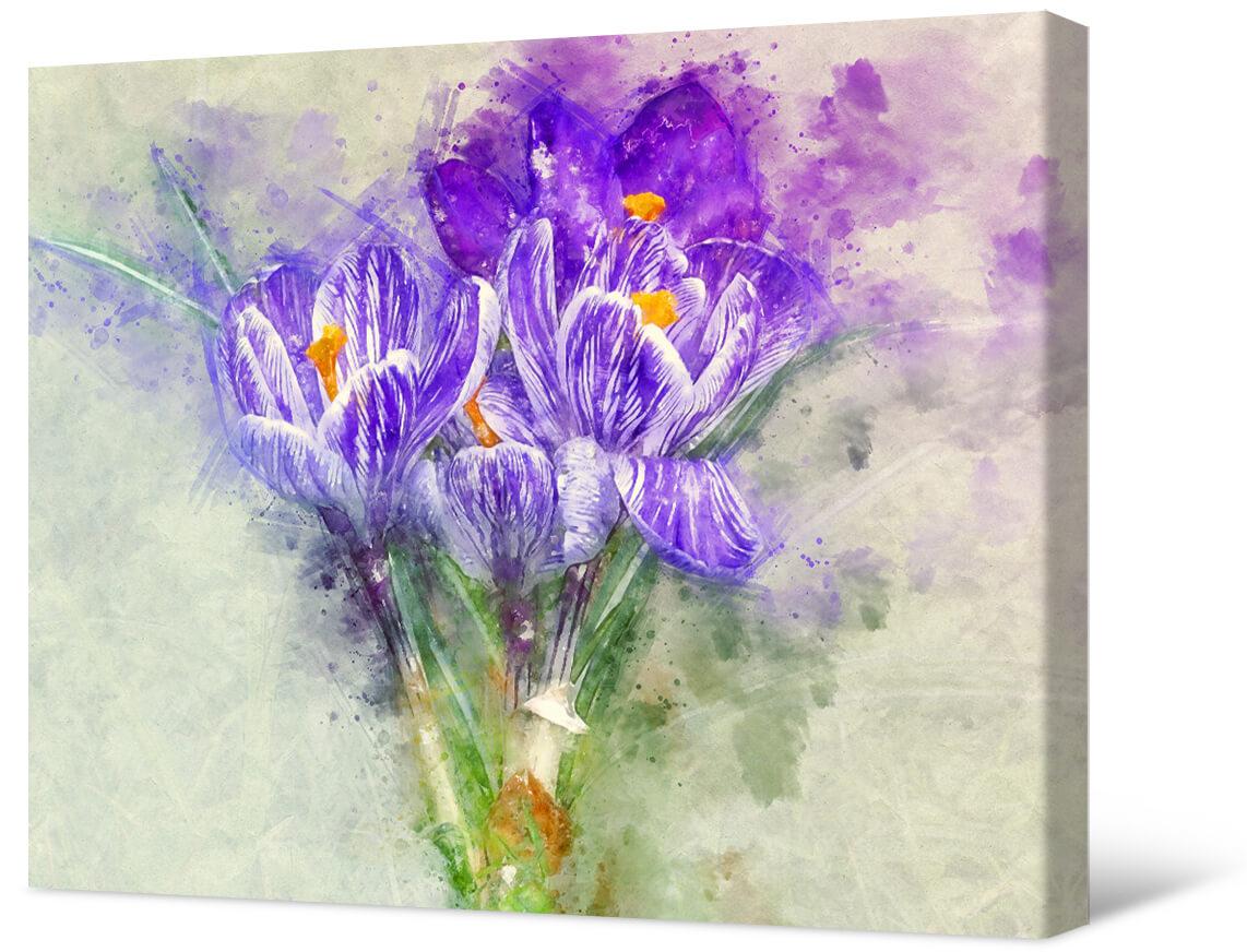 Fotografia na płótnie Akwarela krokusy. Drobno narysowane płatki i akwarelowe wypełnienia wyglądają świetnie. Obraz z jasnymi wiosennymi krokusami można umieścić w salonie, sypialni, pokoju dziecięcym.