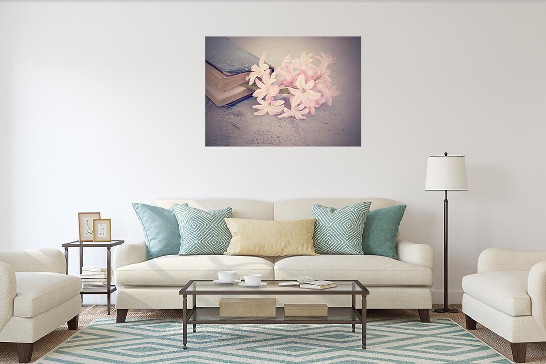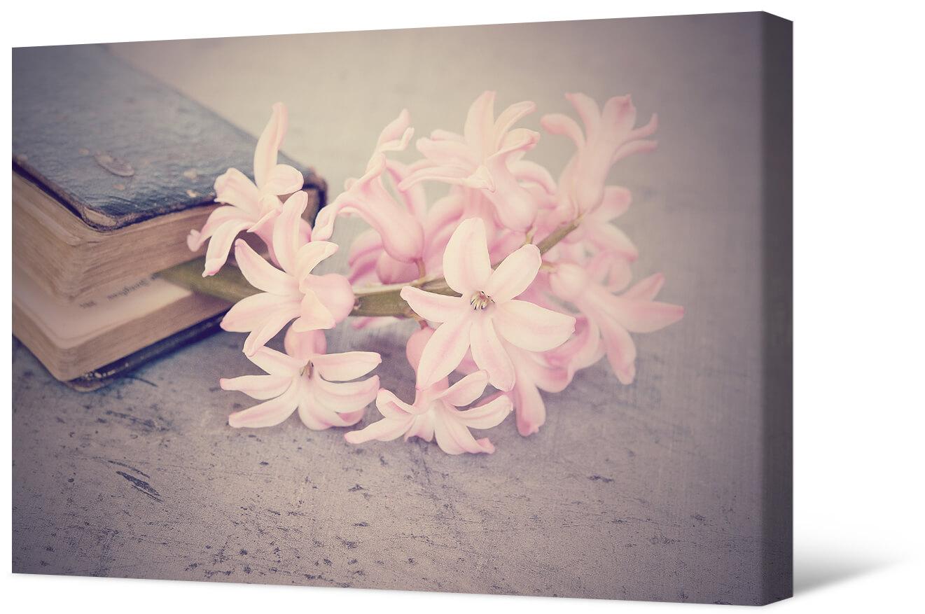 Fotografia na płótnie Różowy hiacynt i książka. Wykonane w stylu retro. Obraz przedstawia starą książkę, aw niej jasnoróżowego hiacynta. praca w pastelowych kolorach będzie pasować do różnych wnętrz.