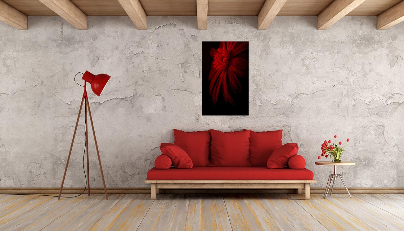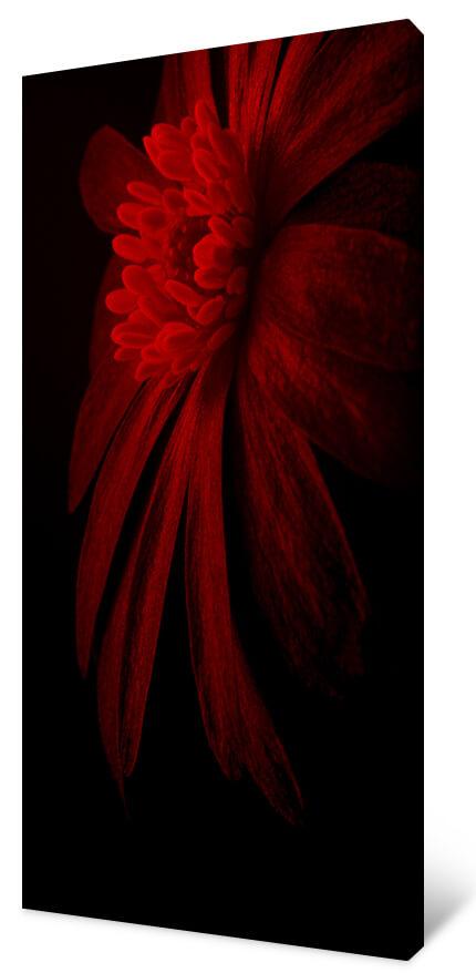 obraz na płótnie Czerwony rumianek. Artysta celowo zastosował nierealistyczne odcienie, aby podkreślić kwiat, nadać mu wyrazistości. Obraz jest jasny i przyciąga wzrok.