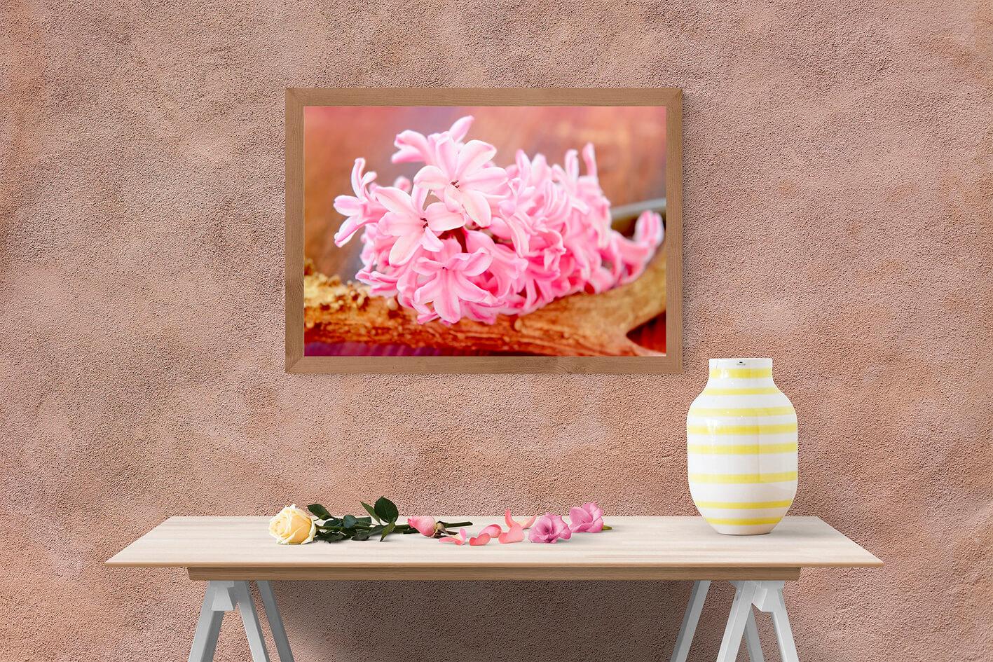 Fotografia na płótnie Kwiaty różowych hiacyntów. Fotografia z bliska pozwala podziwiać piękno tych delikatnych roślin. Obraz jest wykonany w odcieniach różu.