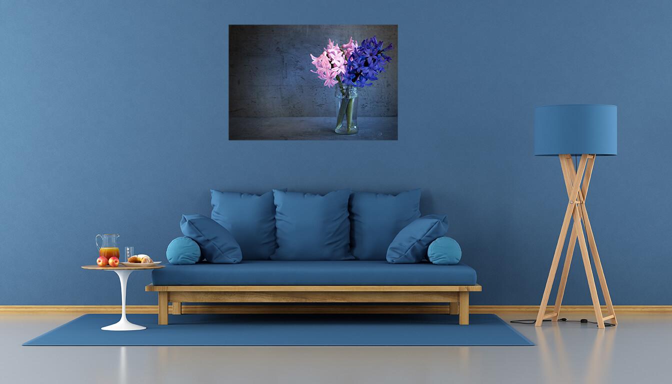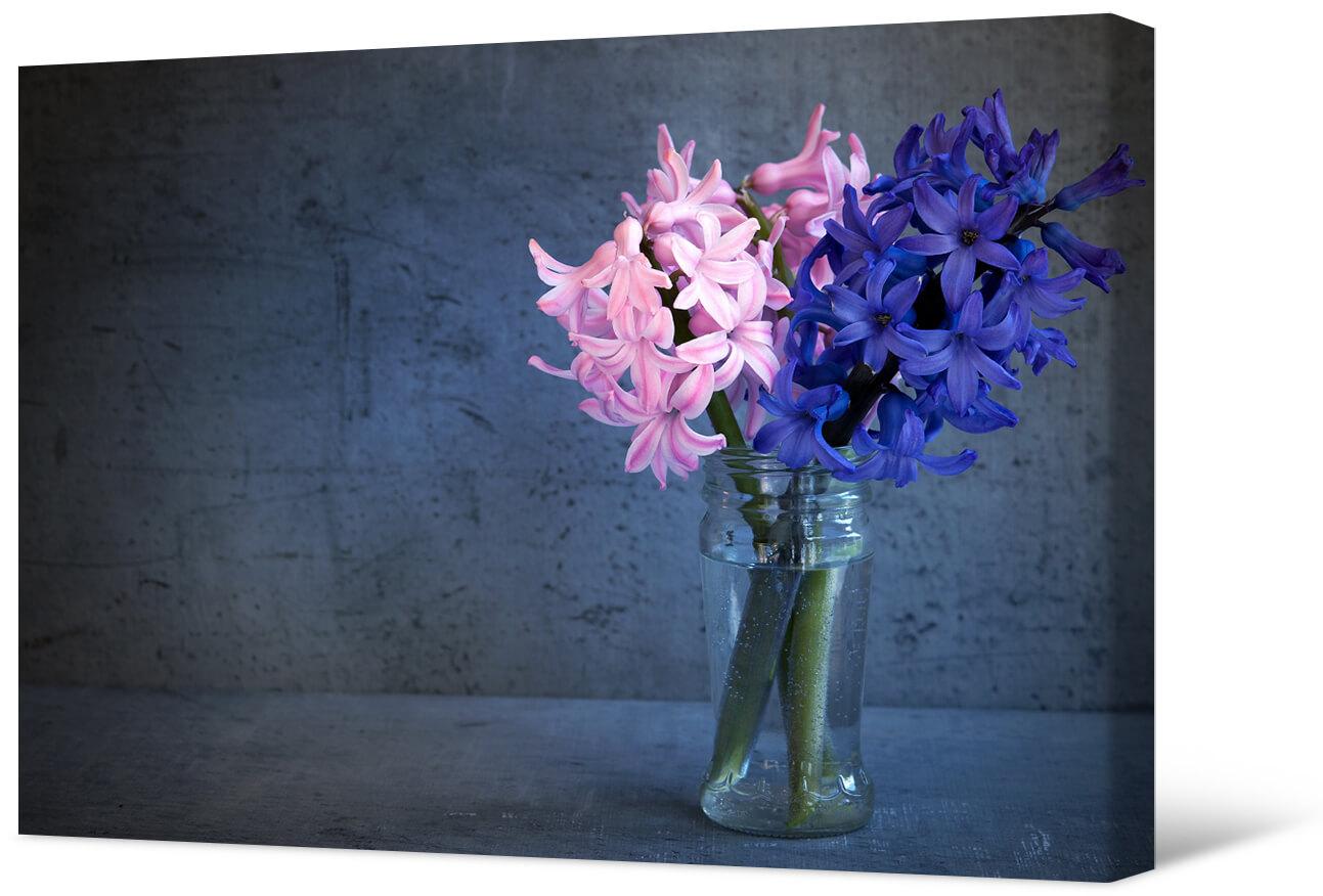 Fotografia na płótnie Niebieskie i różowe hiacynty. Kwiaty hiacyntu są tak piękne, że nie wymagają skomplikowanej dekoracji. Świetnie wyglądają nawet w prostym szklanym słoju. Kontrast różu i błękitu w bukiecie tworzy ciekawy efekt.