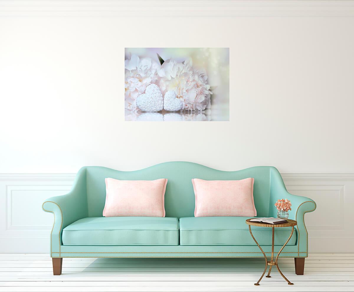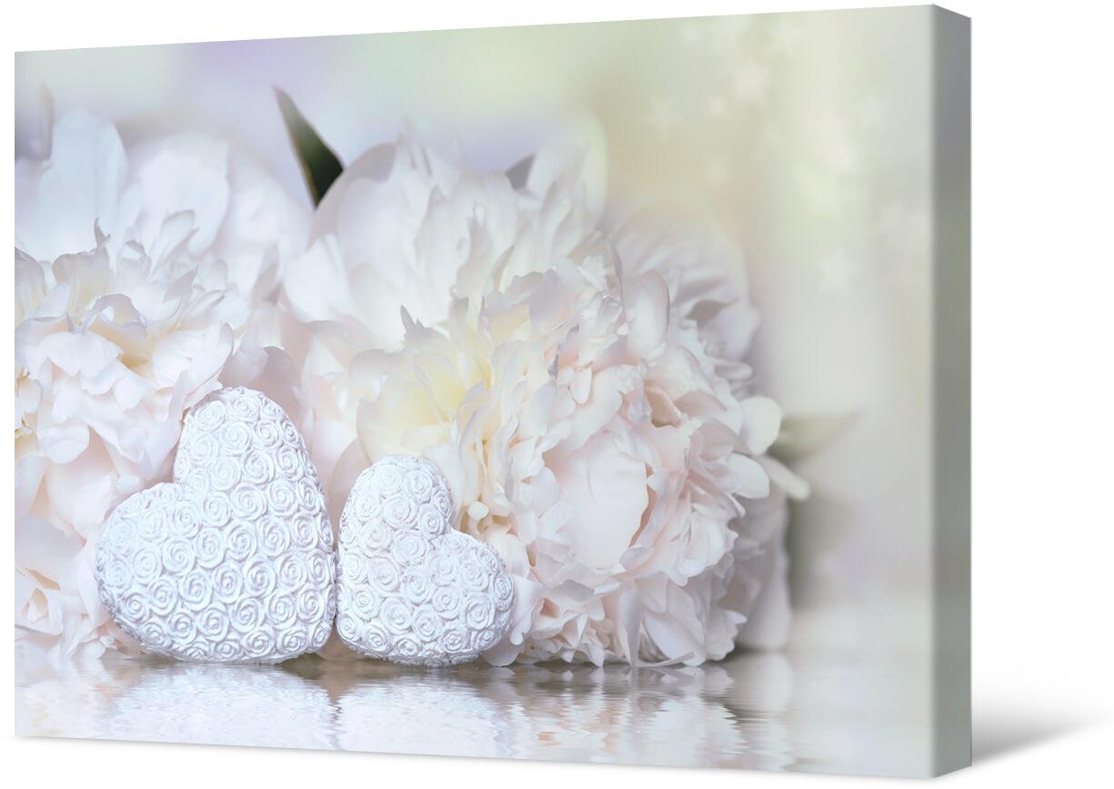 Fotografia na płótnie Białe piwonie i serca. Bardzo romantyczny i delikatny obraz pięknych kwiatów i serc. Taki obraz jest uosobieniem miłości i przywiązania.