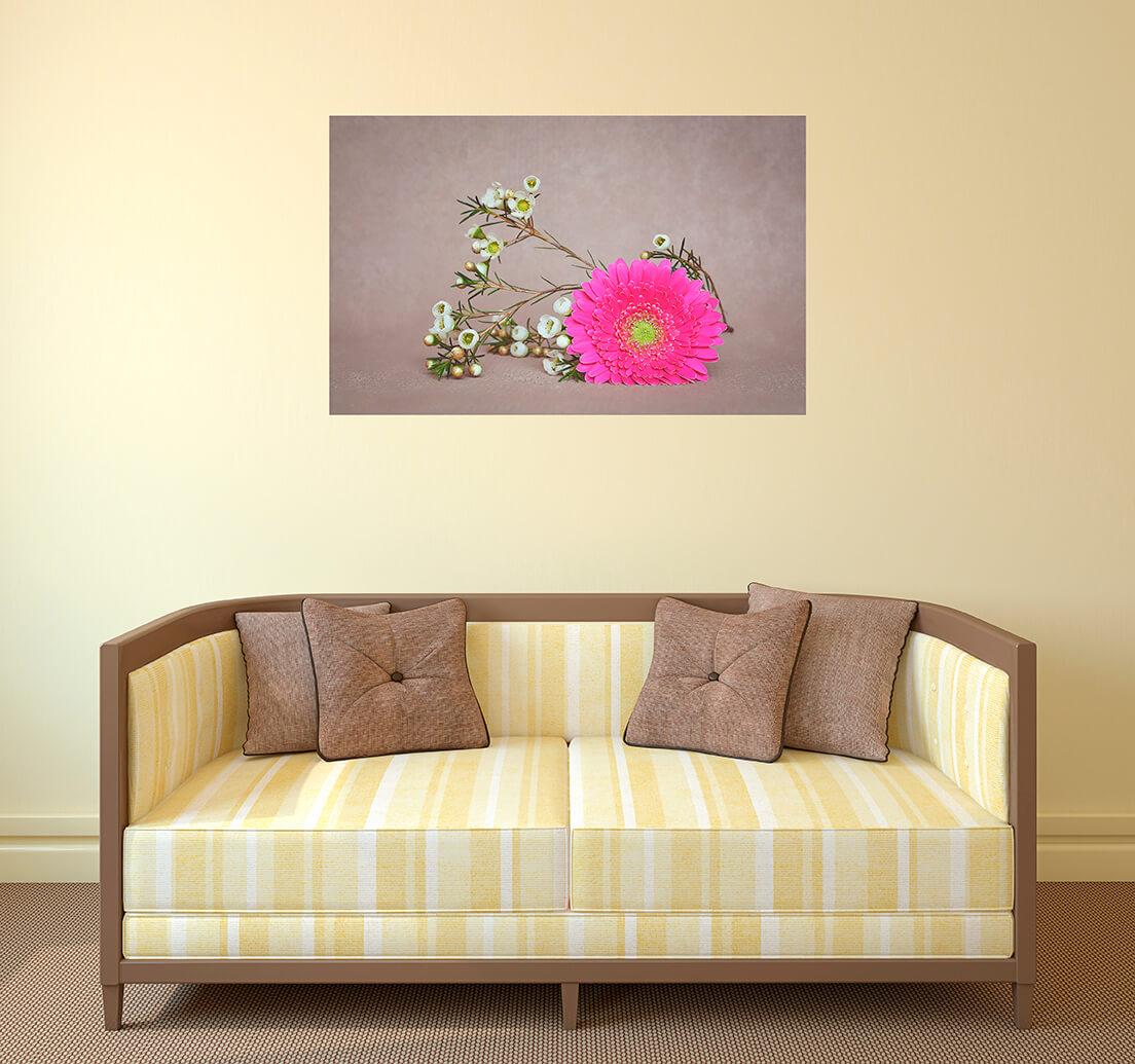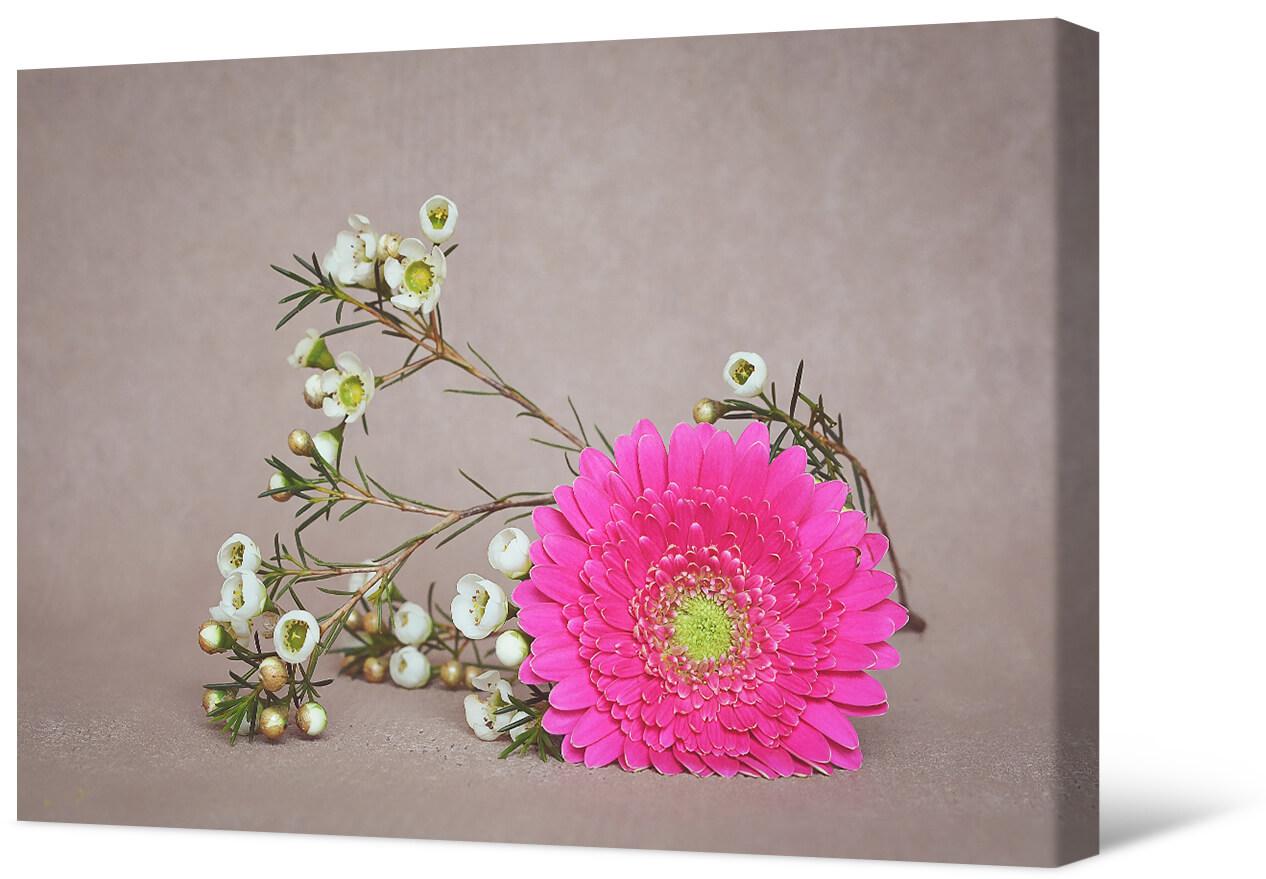 Fotografia na płótnie Różowa gerbera. Jasny kwiat pięknie wyróżnia się na szarym tle. Gałązka z małymi białymi kwiatkami podkreśla wyrafinowanie gerbery.