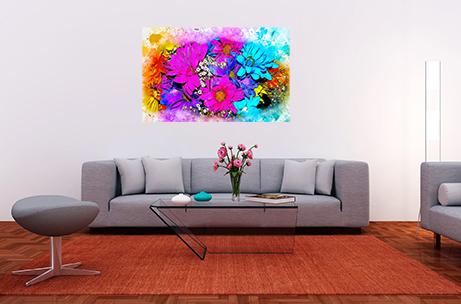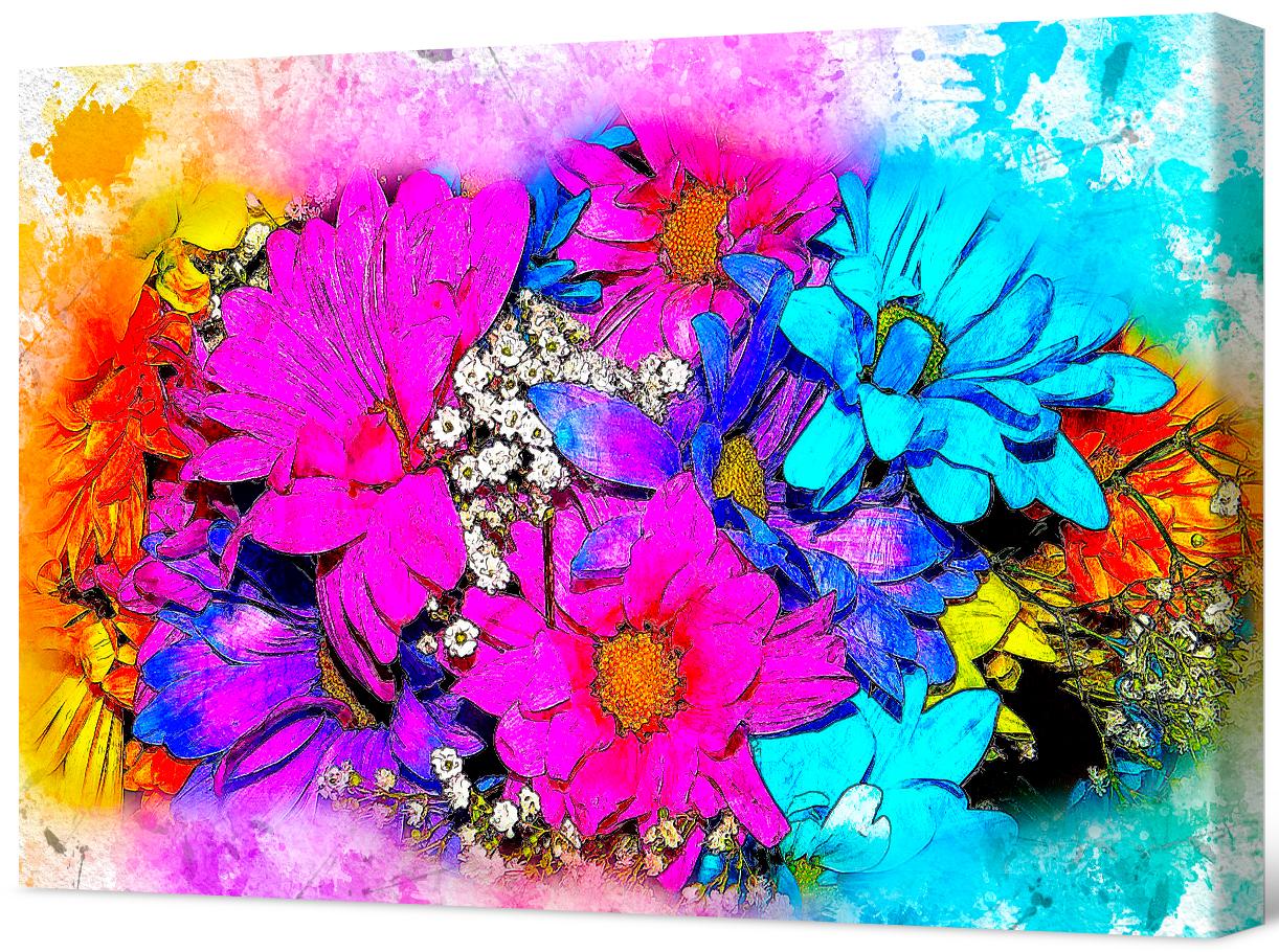 Malowanie zdjęć na płótnie Jasne kwiaty. Stylizowany wizerunek kwiatów, pomalowany nierealistycznie jaskrawymi odcieniami. Obraz jest bardzo wesoły i pozytywny.
