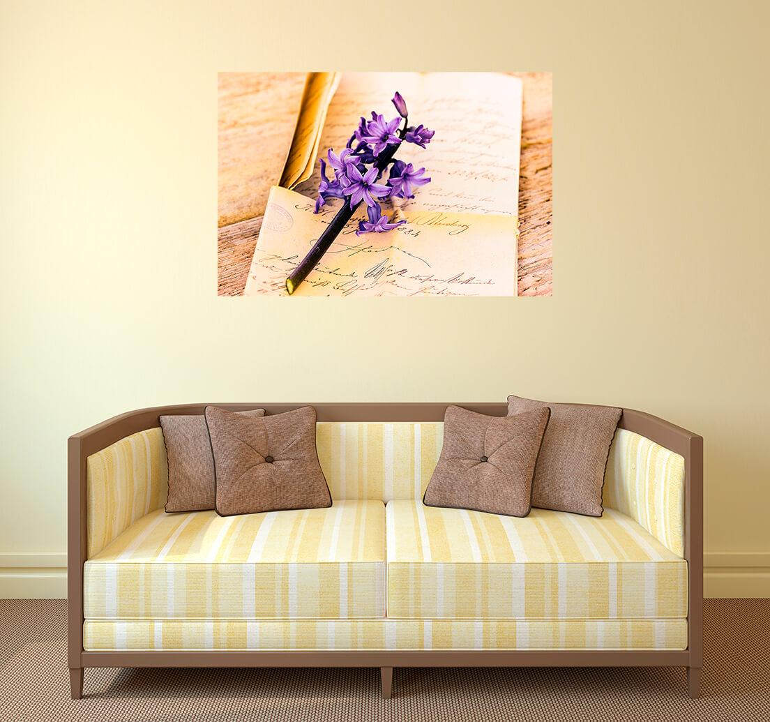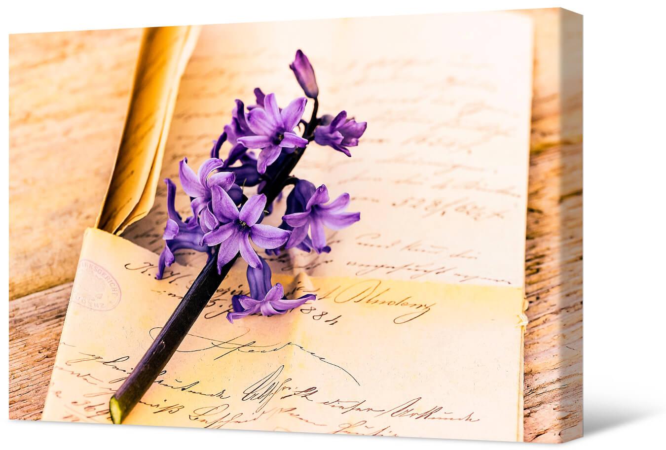 Fotografia na płótnie Kwiatostan listów i hiacyntów. Ciekawe dzieło sztuki fotograficznej. Na tle starych listów leży piękna gałązka hiacyntu.