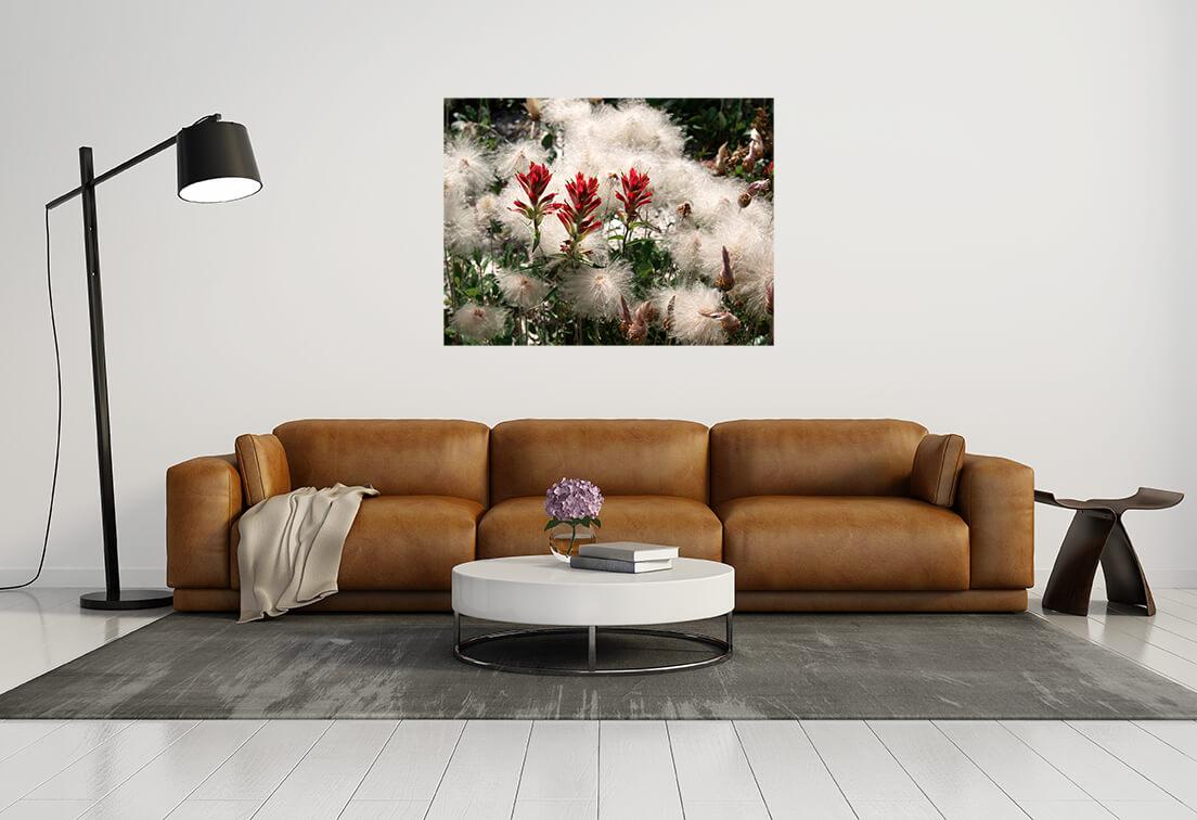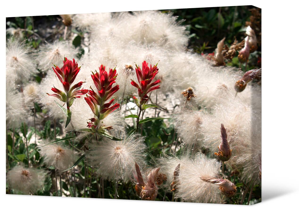 Malowanie zdjęć na płótnie Czerwona szałwia i puch. Kontrast tych roślin wygląda bardzo imponująco na tym zdjęciu. Jasna szkarłatna szałwia jest symbolem pamięci i życia. Puch jest delikatny, miękki i przyjemny.