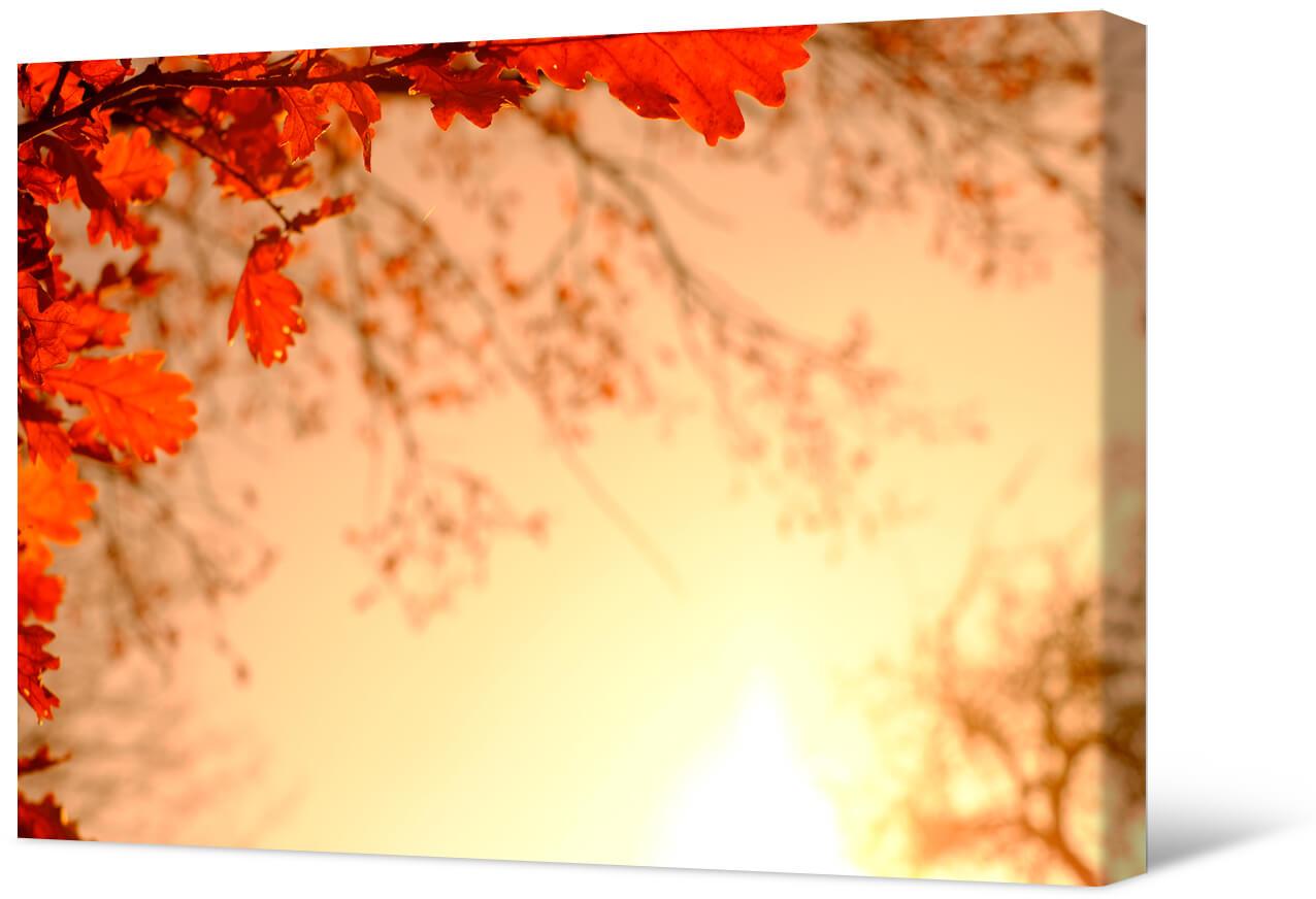 Fotografia na płótnie Jesienny dąb. Piękny i ciepły obraz, jakby przenosił nas do jesiennego lasu. Liście dębu o pięknym jasnym kolorze, oświetlone ciepłym słońcem.