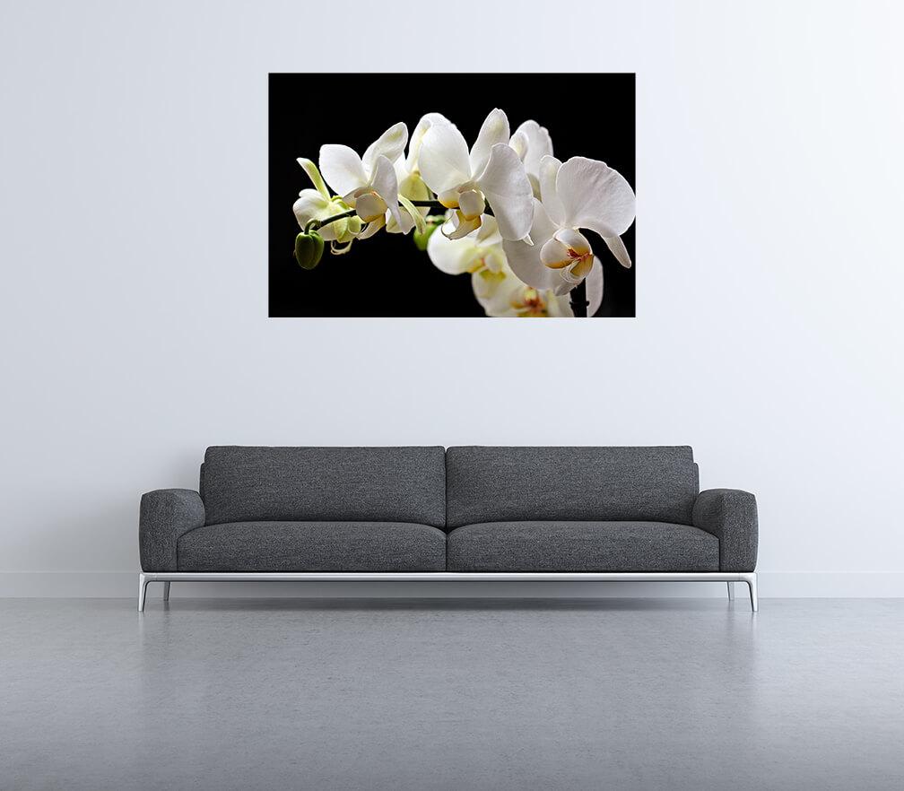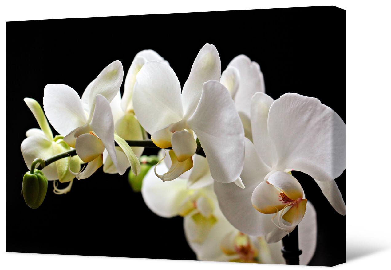 Fotografia na płótnie Biała orchidea na czarnym tle. Kontrast na tym zdjęciu pozwala podkreślić szczególne piękno tej gałęzi. Orchidee są idealne i piękne, ozdobią każde wnętrze.