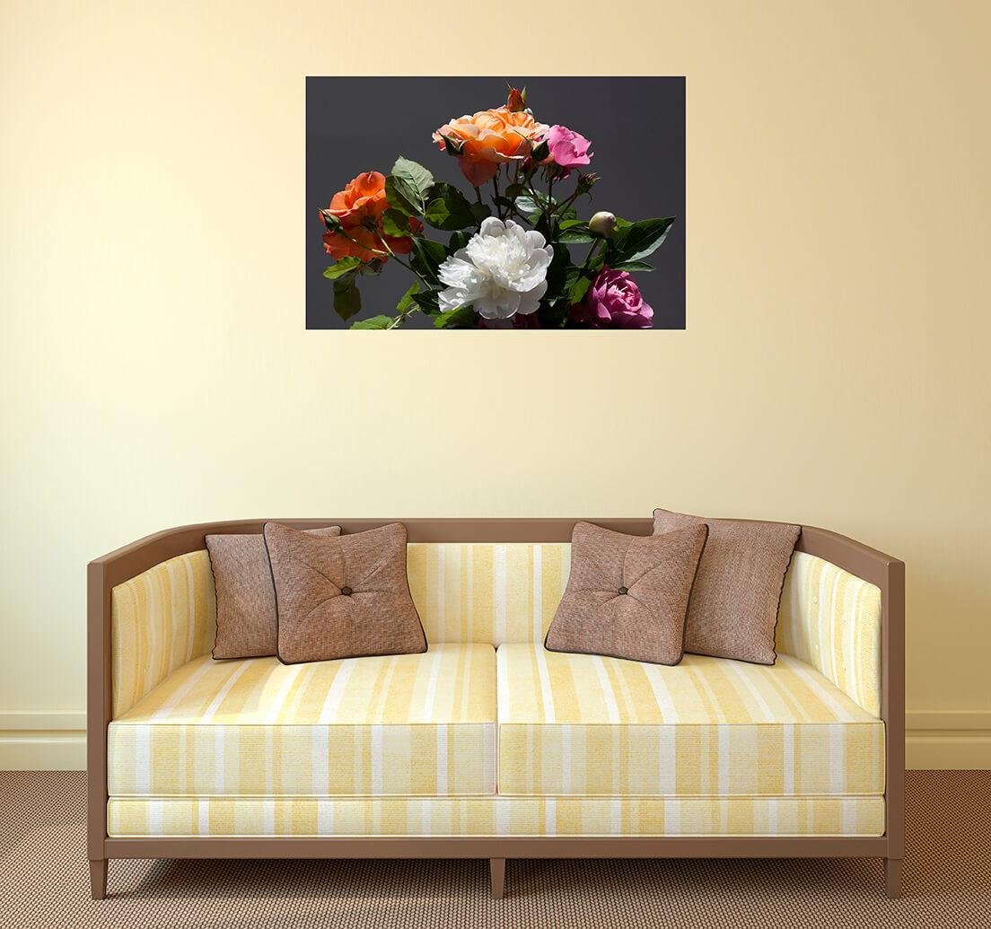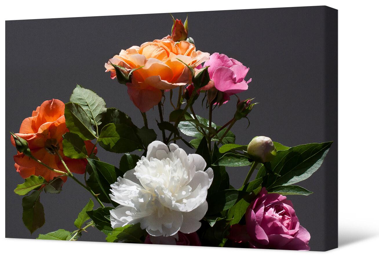 Fotografia na płótnie Bukiet róż i piwonii. Piękny obraz do Twojego domu. Przedstawia piękny bukiet pomarańczowych i różowych róż oraz bujnych piwonii.