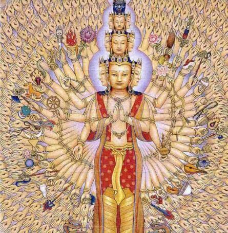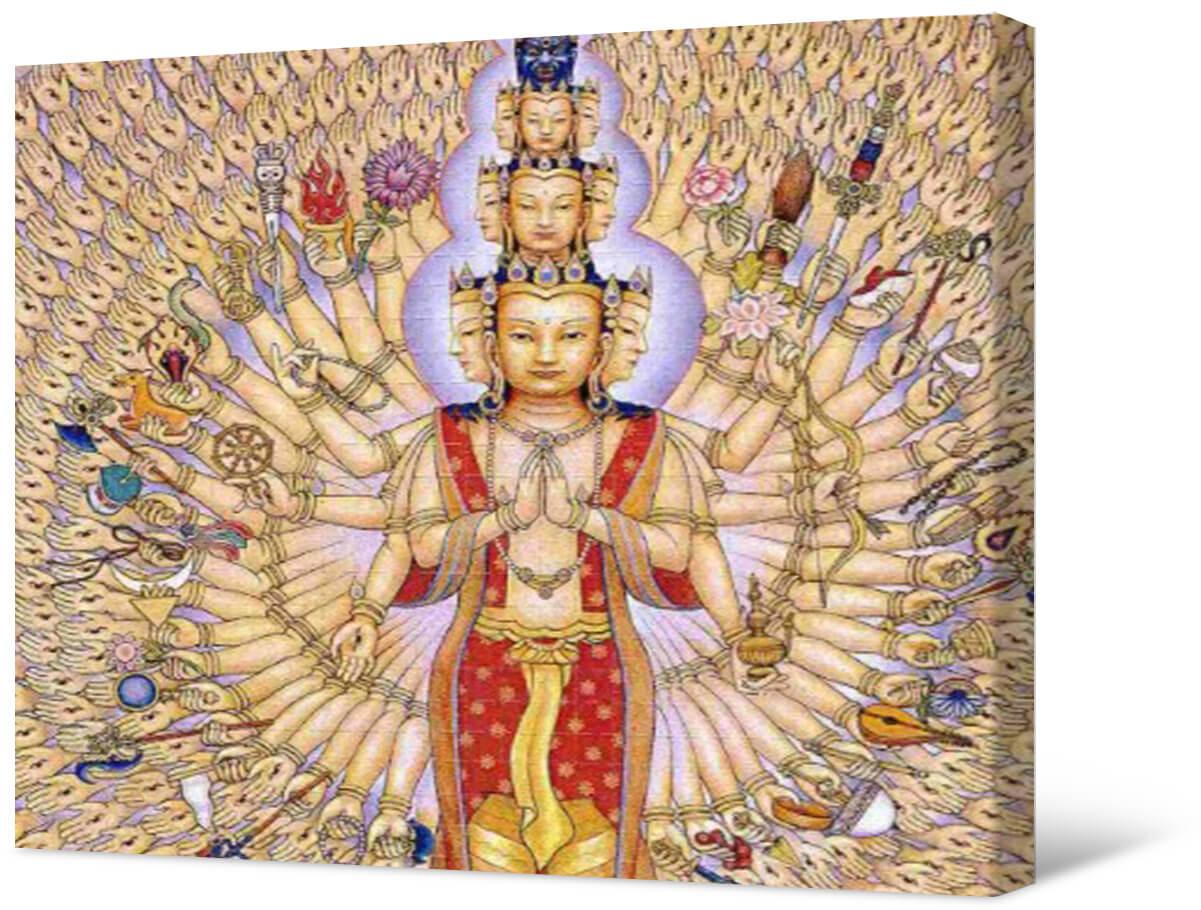 Malarstwo fotograficzne na płótnie autorstwa Guan Yin. Imię Guan Yin można z grubsza przetłumaczyć jako „słysząca całe cierpienie świata” – bóstwo żeńskie, które ratuje z wszelkiego rodzaju kłopotów, pomagając wszystkim, którzy się do niej zwracają, zwłaszcza kobietom rodzącym i kobietom w ciąży. Gdy ktoś potrzebuje pomocy, ma tysiąc rąk, a na każdej dłoni okiem, by widzieć każdego, kto potrzebuje jej wsparcia Chroni dzieci i chroni je przed chorobami.