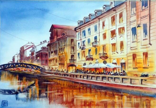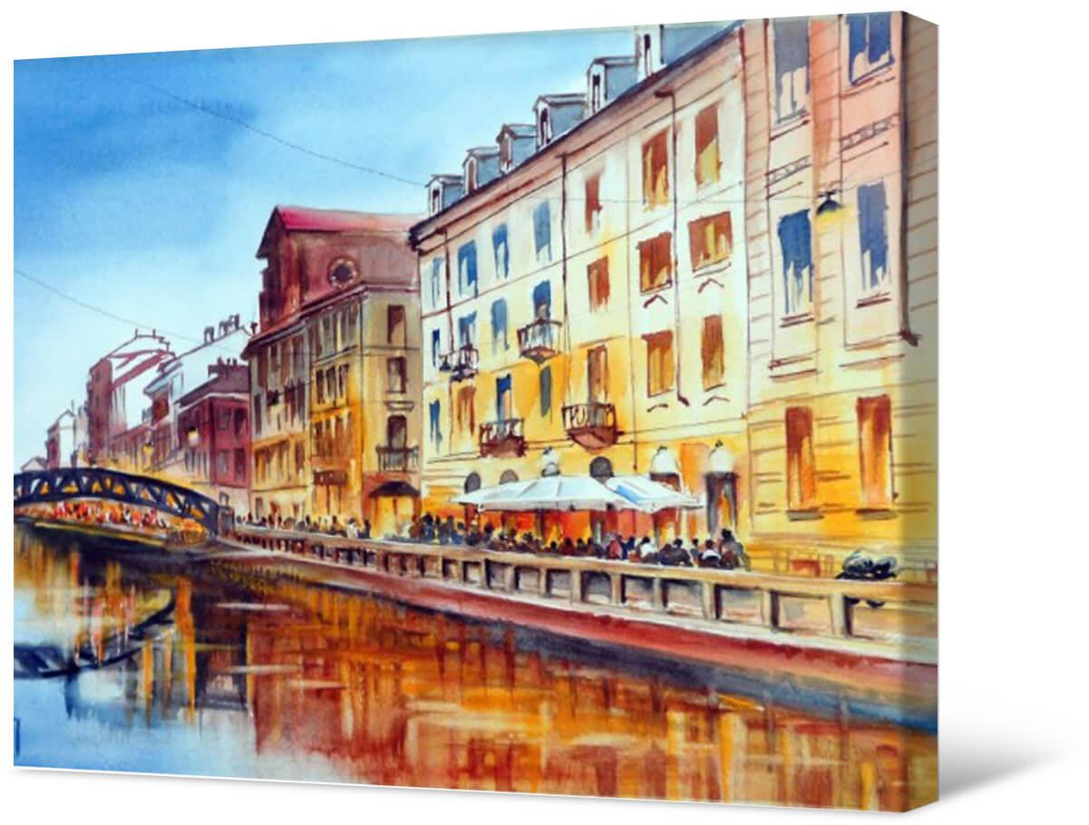 Malarstwo fotograficzne na płótnie Mediolan. Przytulne domy i rzeka przyciągają uwagę swoim wyrafinowaniem. Obróbka akwareli pozwoliła uzyskać szczególnie delikatny i piękny obraz.
