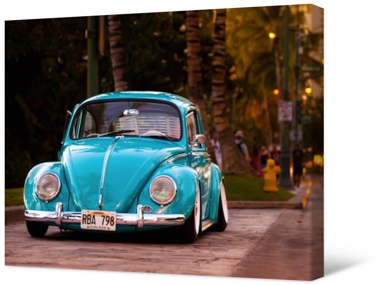 Fotografia na płótnie Niebieski Volkswagen Beetle. Stary model auta idealnie wkomponuje się w każde wnętrze. Fanom samochodów retro spodoba się.