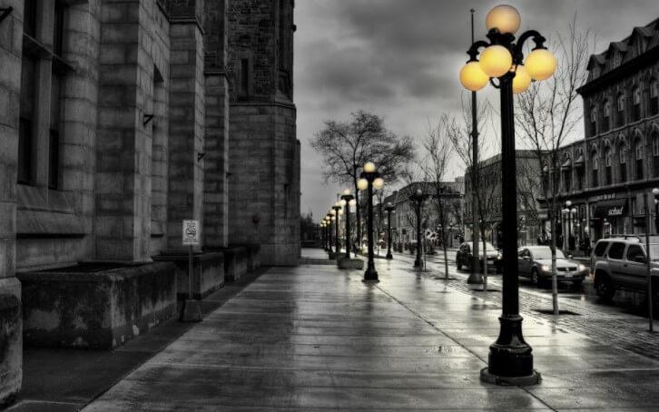 Fotografia na płótnie Szara ulica. Monochromatyczna ulica z jasnym akcentem w postaci lamp ulicznych. Nadaje się do pomieszczeń o stonowanych odcieniach ścian.