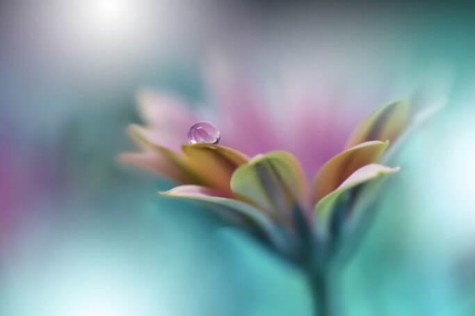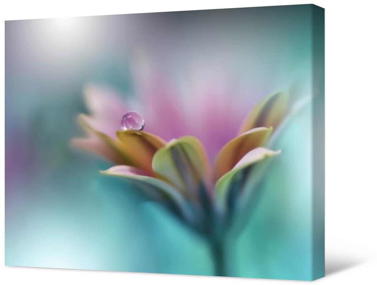 Fotografia na płótnie Kwiat z kroplą. Rozmyte tło i rozmyte brzegi kwiatu dodają mu tajemniczości i uroku. Odpowiedni dla tych, którzy lubią gładkość we wnętrzach.