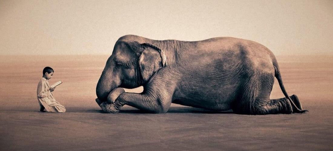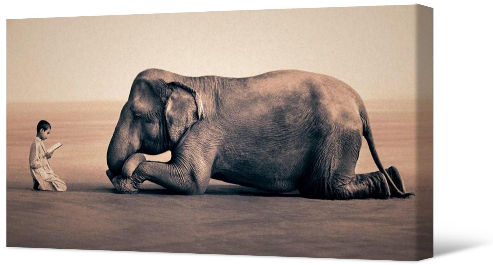 Fotografia na płótnie Słoń i dziecko. Wzruszający i czuły obrazek przedstawiający dziecko czytające książkę słoniowi. Idealny do wnętrza pokoju dziecięcego.