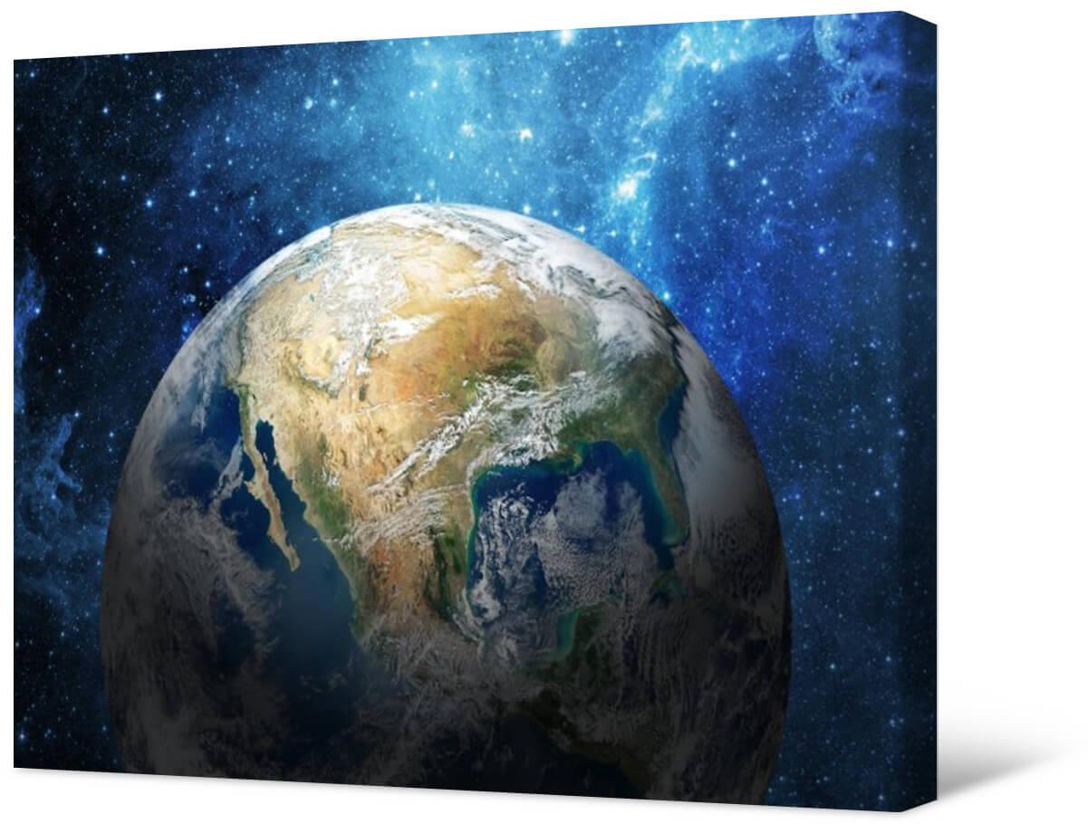 Malowanie fotografii na płótnie Planeta Ziemia. Widok planety wśród rozgwieżdżonej przestrzeni przypadnie do gustu miłośnikom astronomii i po prostu pięknych zdjęć. Idealne rozwiązanie dla najpiękniejszych i najbardziej kreatywnych wnętrz.
